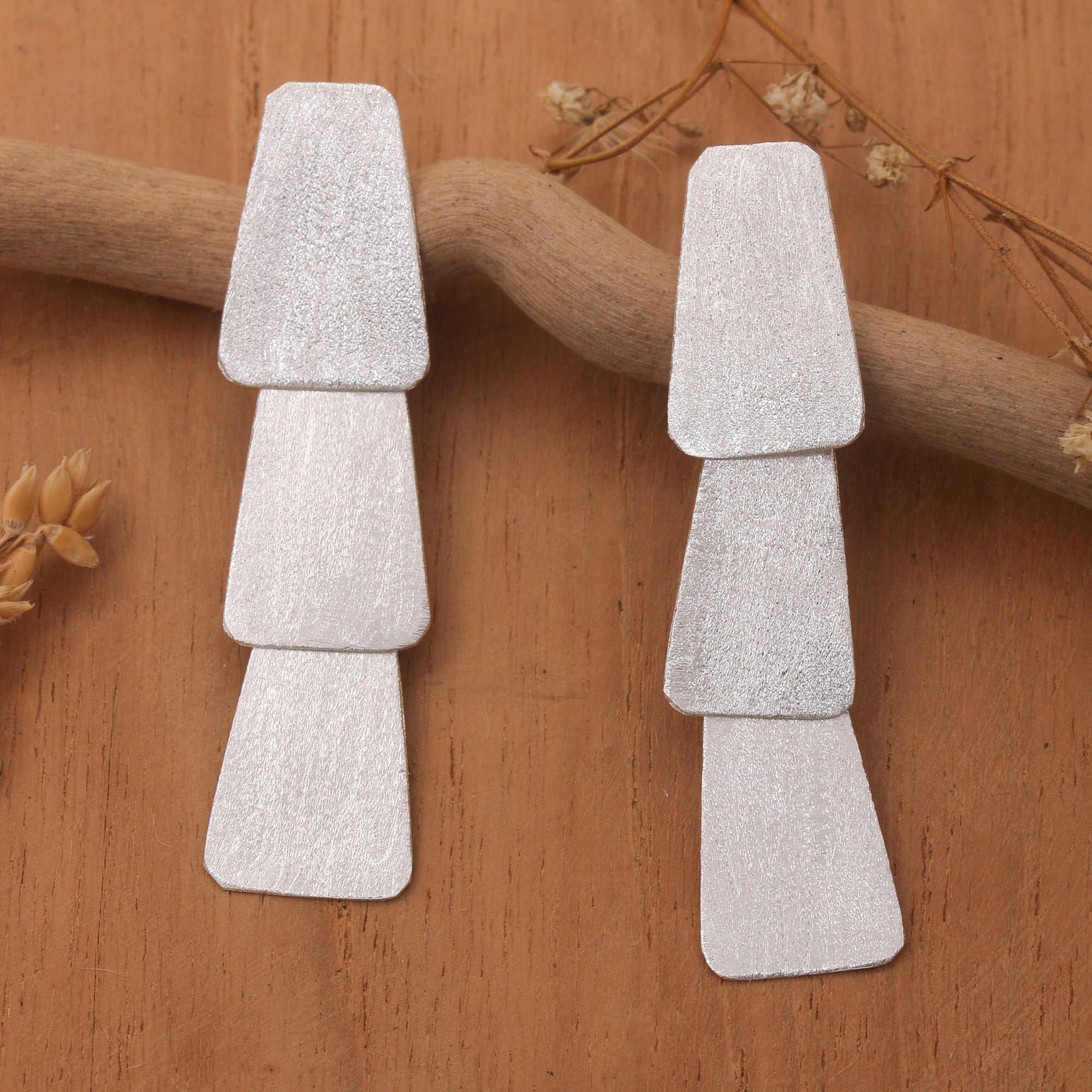 Brushed-Satin Modern Sterling Silver Dangle Earrings, 'Contemporary Lady'