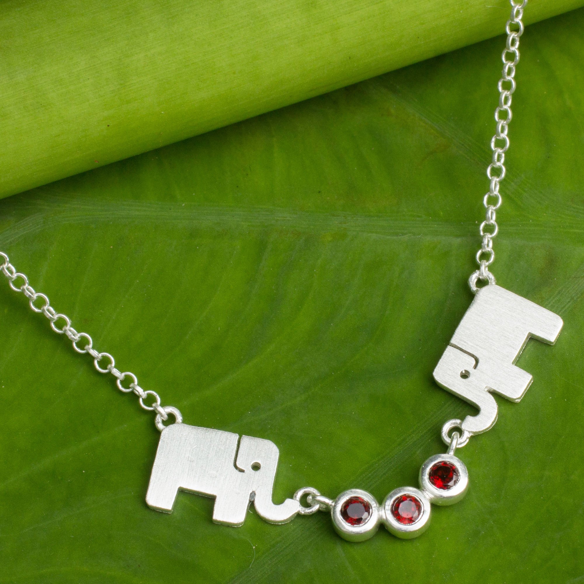 In a sweet display of pachyderm gratitude, a gentle elephant shares his wealth with a friend. Thai artisan Jantana presents a sterling silver necklace in her signature style, with a brushed satin finish. The two elephants flank three crimson garnets.