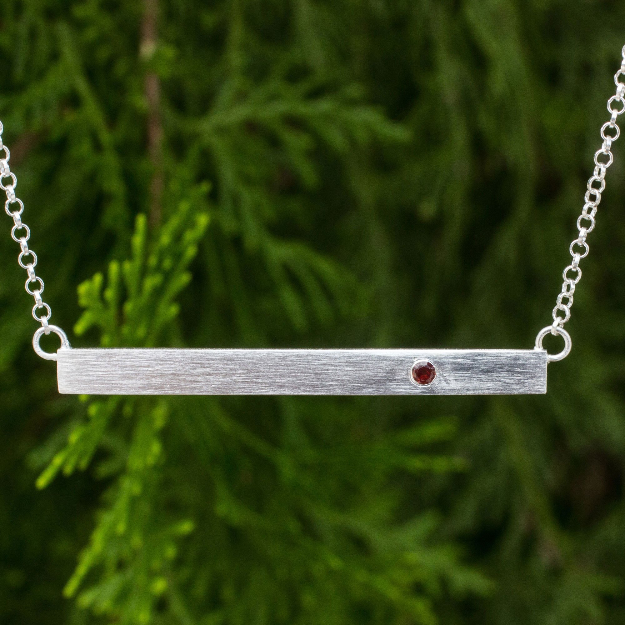This sleek and contemporary pendant necklace is presented by the talented Jantana in Thailand. Working in sterling silver with her signature brushed satin finish, she adds a sparkling garnet, the gemstone of passionate devotion, to a pendant of elegant simplicity. The pendant is suspended on a sterling silver rolo chain.