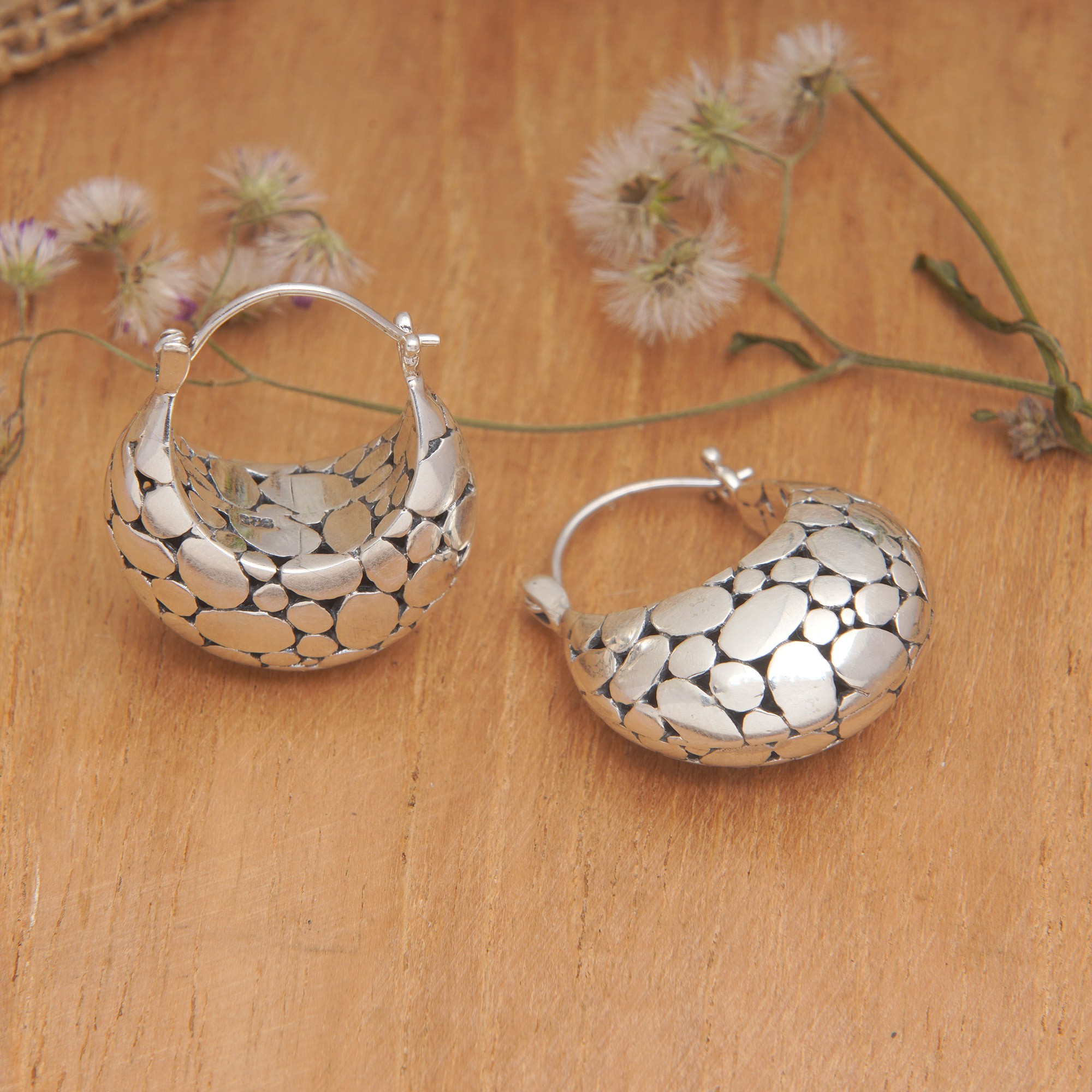 Bubble-Patterned Sterling Silver Hoop Earrings from Bali, 'Bubble Lady'