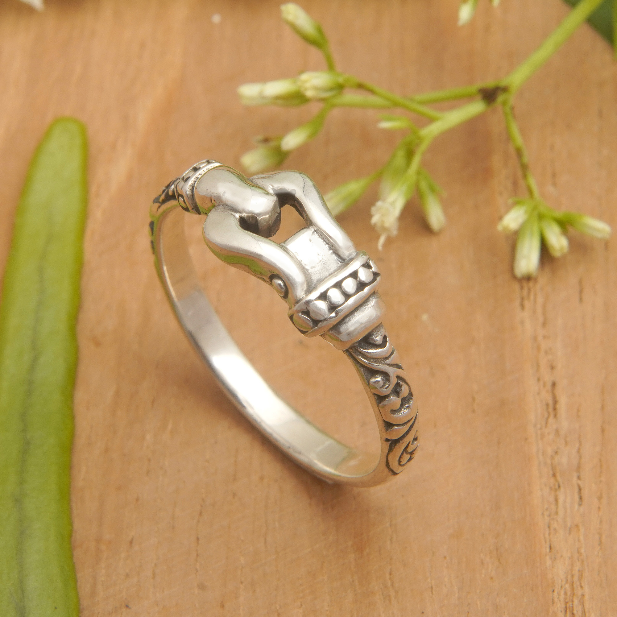 With a unique buckle-shaped accent on the front and a band exquisitely decorated with traditional Balinese motifs, this amazing sterling silver ring is sure to make a statement. The combination of oxidized and polished finishes enhances the striking beauty of this extraordinary design presented by Bali's Putu Putri.