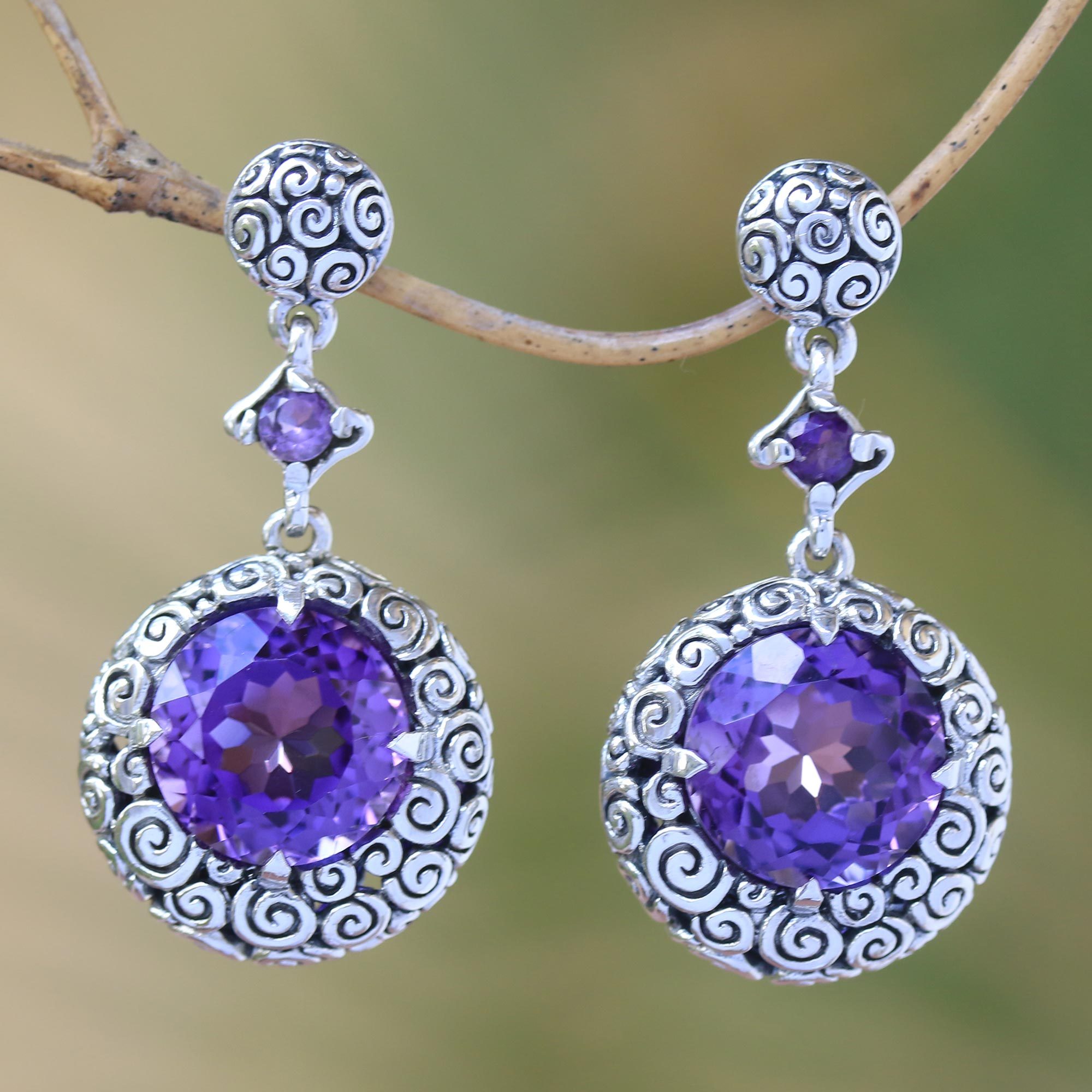 Buddha Curl Motif Amethyst Dangle Earrings from Bali, 'Moonlight Dazzle'