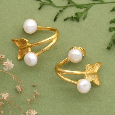 Enchanting butterflies flutter around these drop earrings crafted in the paradisial Balinese lands. Artisan Suana Yasa displays exquisite artistry in each detail composing these 18k gold-plated accessories, whose luminous light is accompanied by cultured pearls in a natural silver-white hue, representing the region's sea richness.