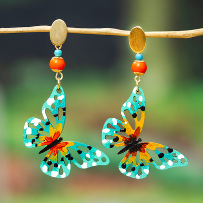 Hand-painted in mint, orange and teal hues, precious butterflies spread their wings in an enchanting design from Mexican lands. Crafted by the talented artisan Alejandra Gallardo, these wood dangle earrings enrich their beauty with 24k gold-plated brass accents and natural agate stones, whose intense light crowns this fantasy-inspired pair.