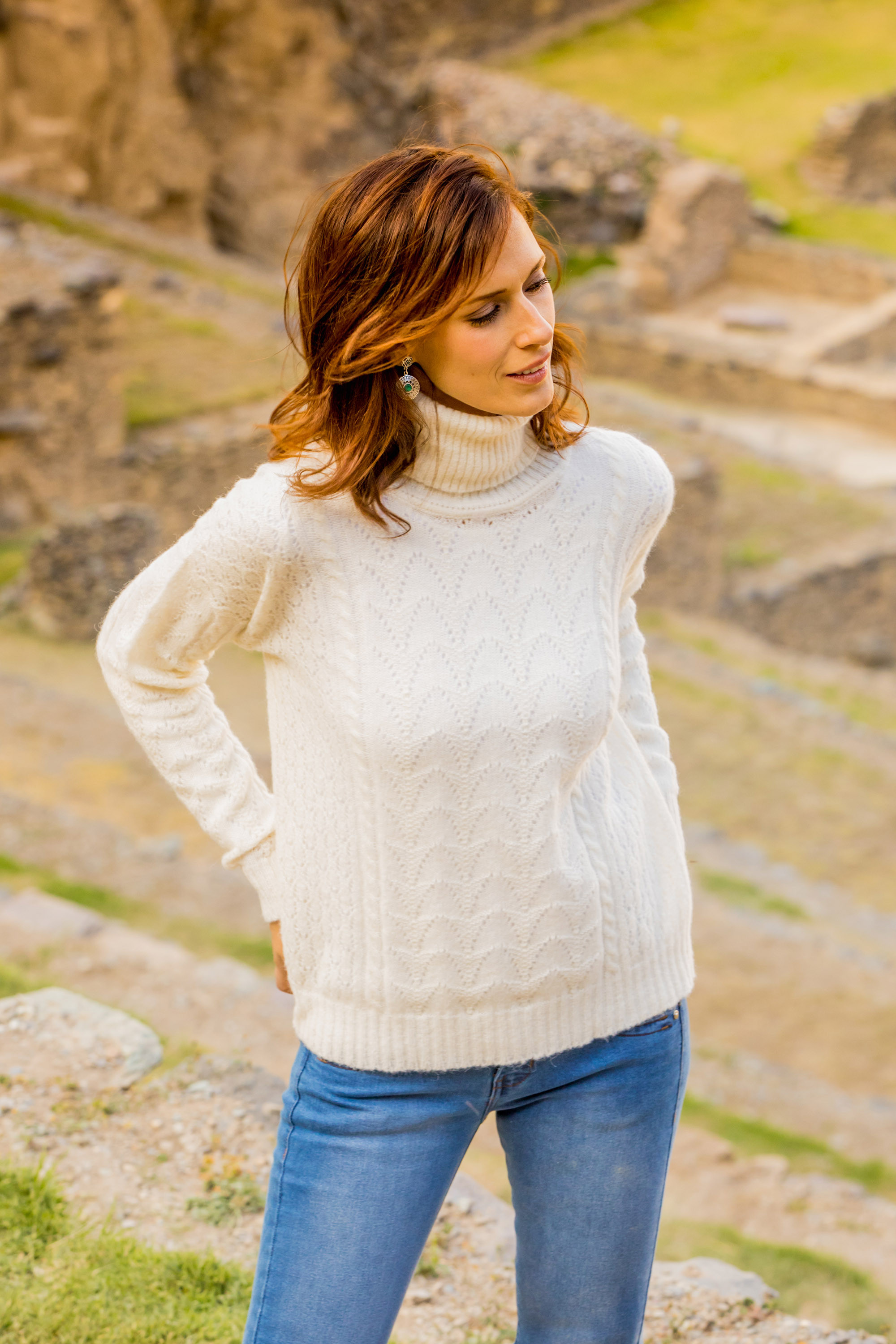 Working with a baby alpaca blend in solid alabaster, Peruvian artisan Wilber Calapuja creates this warm pullover. He knits the turtle neck pullover to feature cable and openwork patterns, long sleeves, and a drop shoulder. Baby alpaca refers to the fine fleece from the season's first shearing.