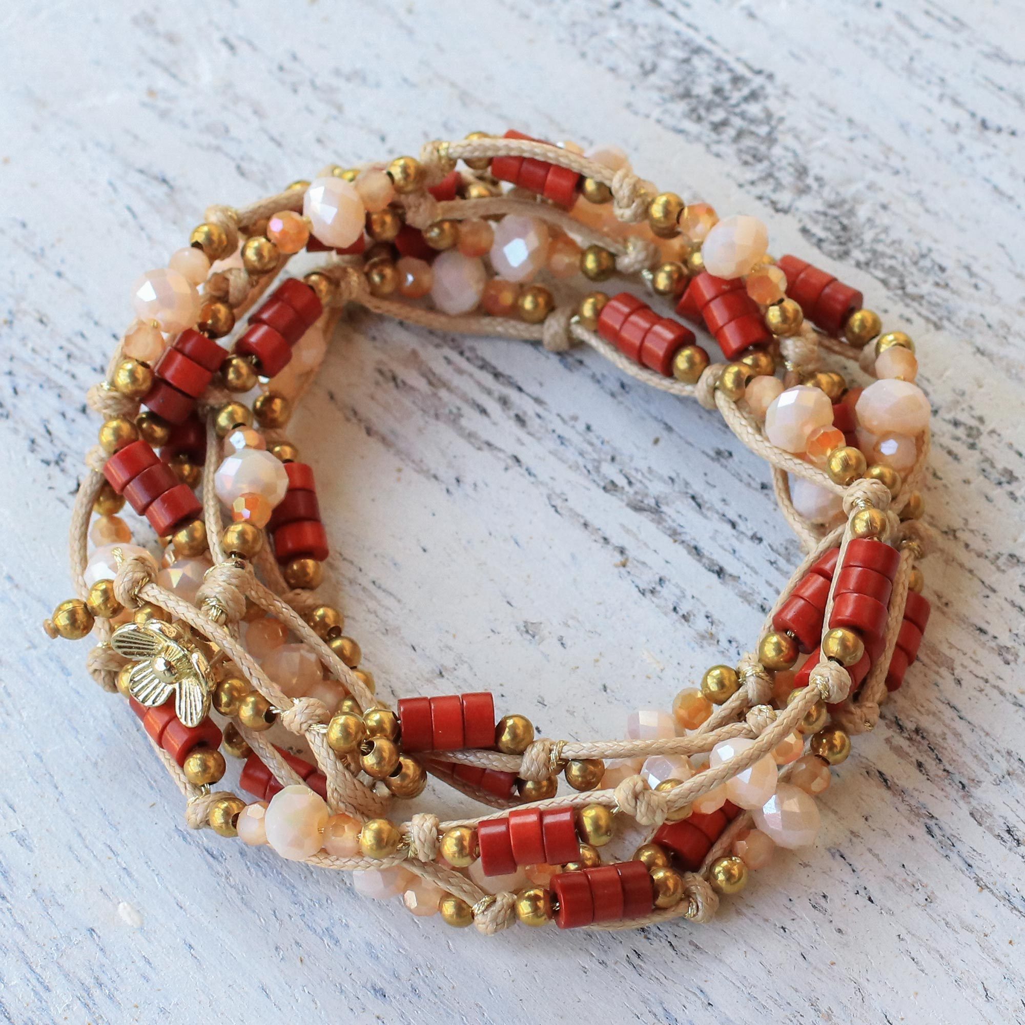 The perfect accessory for festive occasions, this amazing wrap bracelet from Thailand is sure to be the life of the party. Nareerat designs the bracelet, using braided beige cord alongside beads of brass, glass, and red calcite. A petite brass flower charm serves as a button clasp to complete the bracelet.