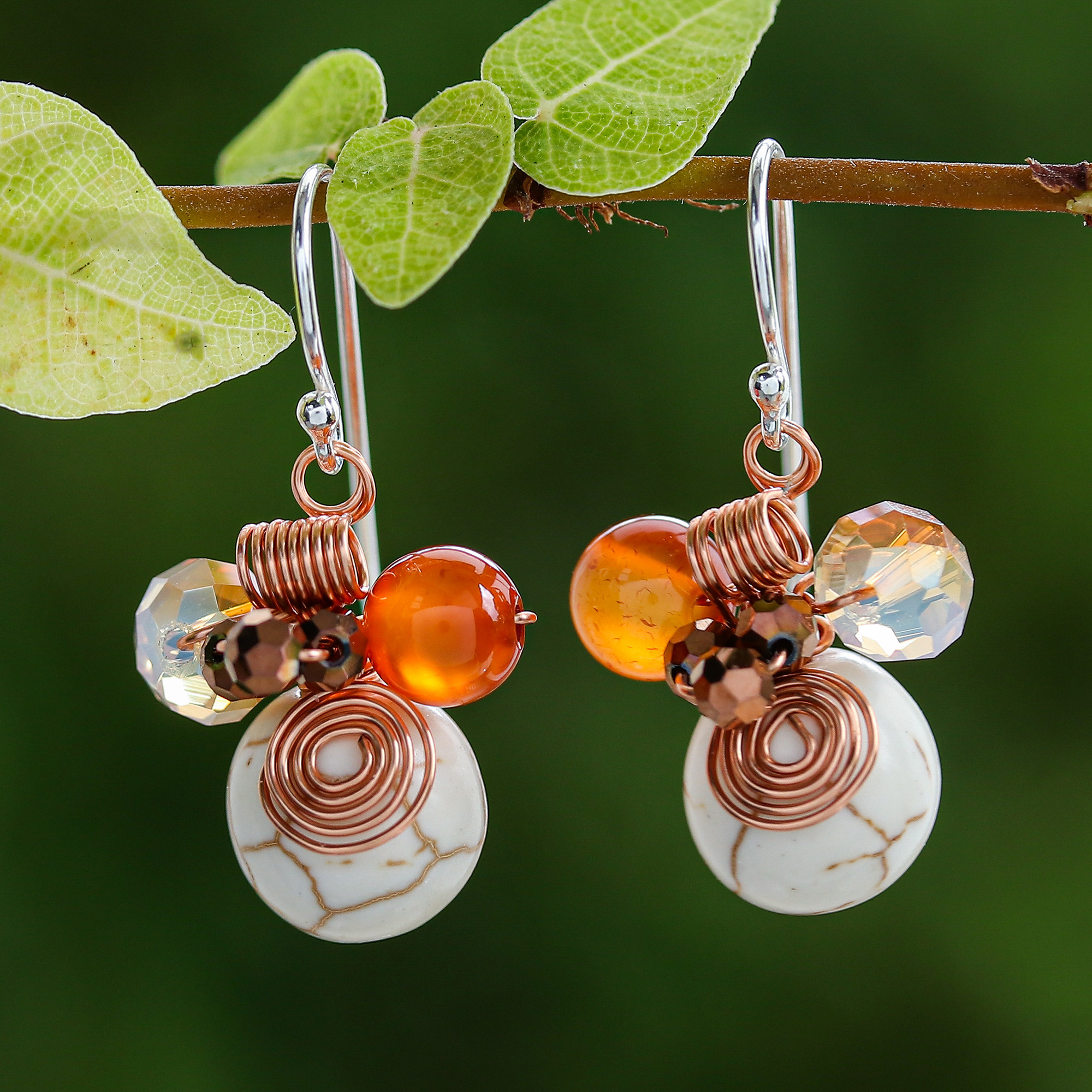 Resembling white and orange bubbles floating in the air, these earrings are a playful addition to a fun, casual outfit. Thai artist Nareerat crafts these dangle earrings from a combination of dyed round quartz, glass beads, and twisted copper wire accents. The earrings hang from sterling silver hooks.
