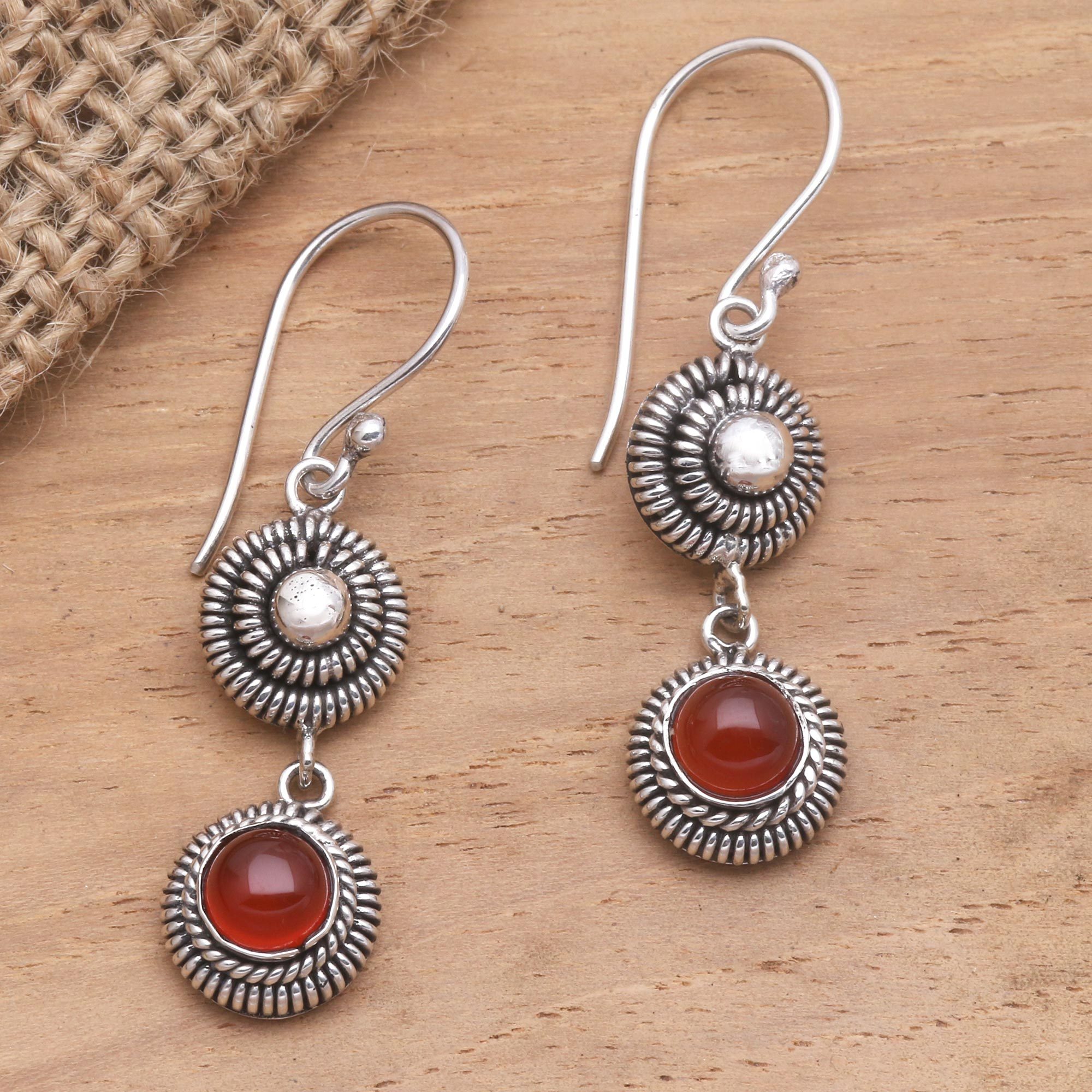 These lovely earrings designed by Java's Rosalia Tarigan are perfect for a romantic fireside evening. The artisan frames a sterling silver orb and a carnelian gemstone in hand-wrapped silver wires, while elegant silver hooks finish the pretty pair.