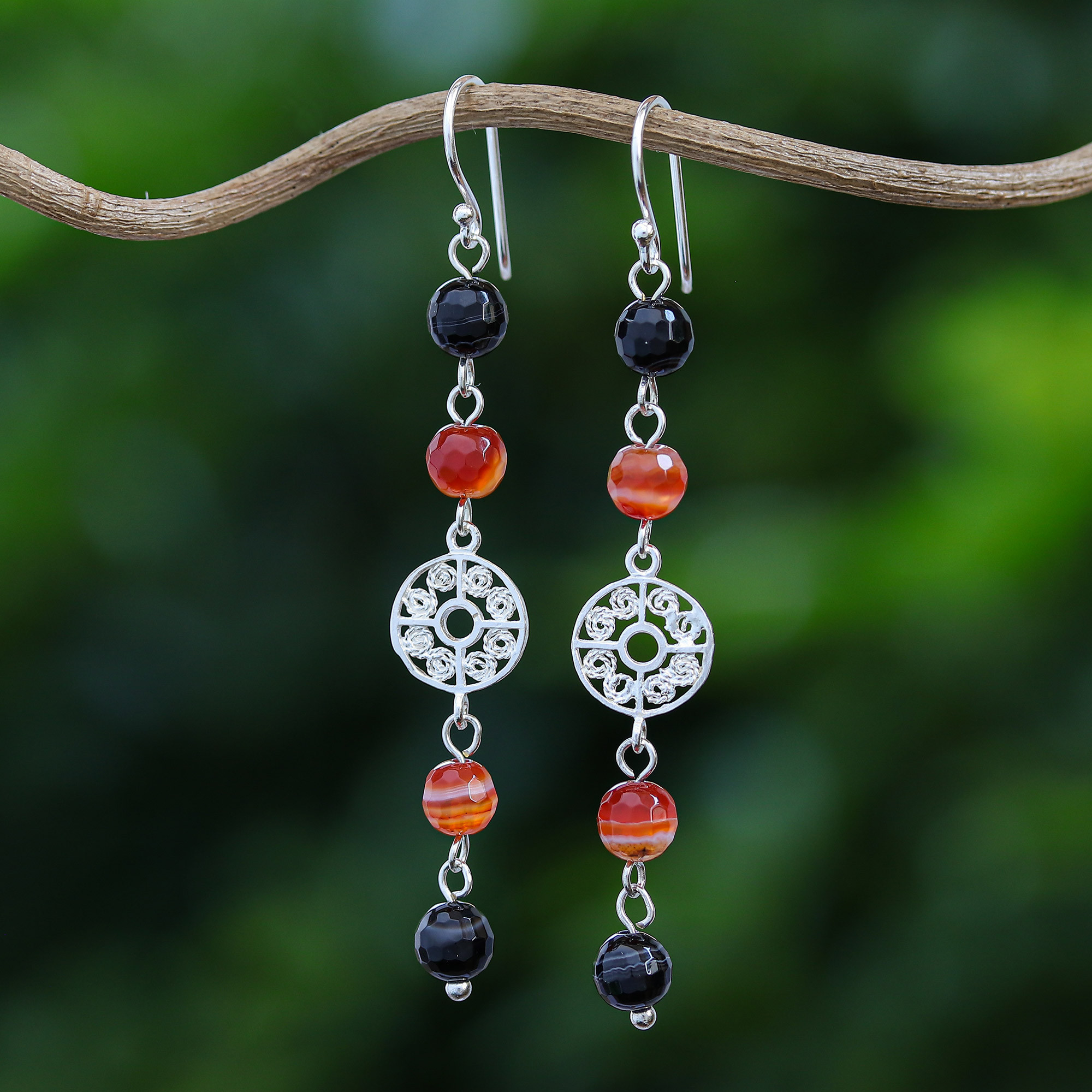 Carnelian and Onyx Silver Dangle Earrings, 'Filigree Day'