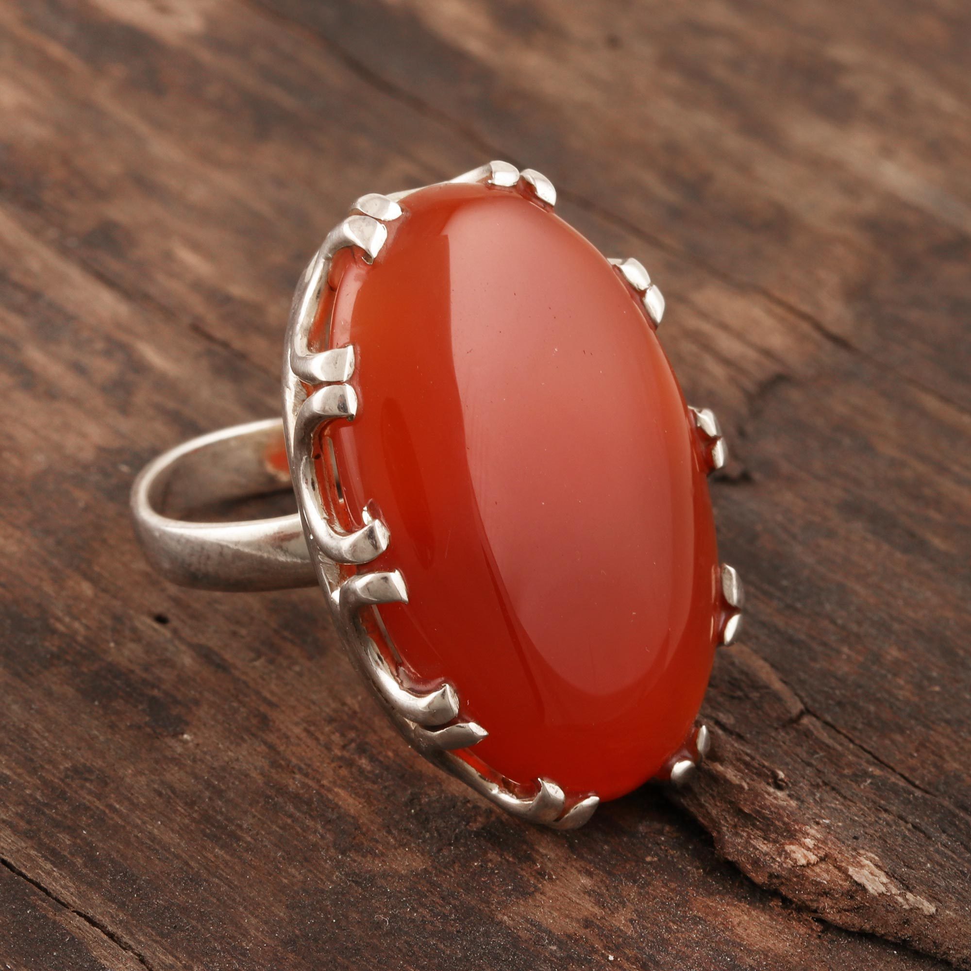 The warm glow of carnelian distinguishes this simple but elegant cocktail ring from Alok Jain in India. Artisans craft the ring from sterling silver with a polished finish.