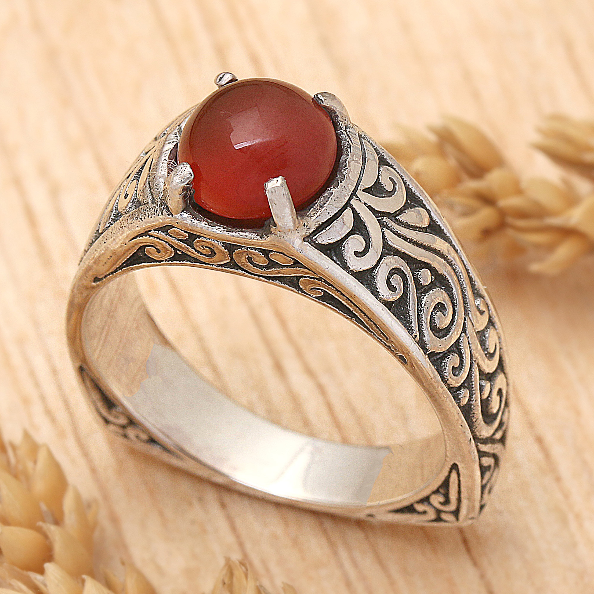 A single stone of natural carnelian possesses a fiery orange-red glow, cradled at the top of this ring from Bali. Local artisans craft the ring by hand, elaborating the sterling silver band with intricate spiral motifs that evoke the beauty of Uluwatu Temple, located on a towering cliff above the sea.