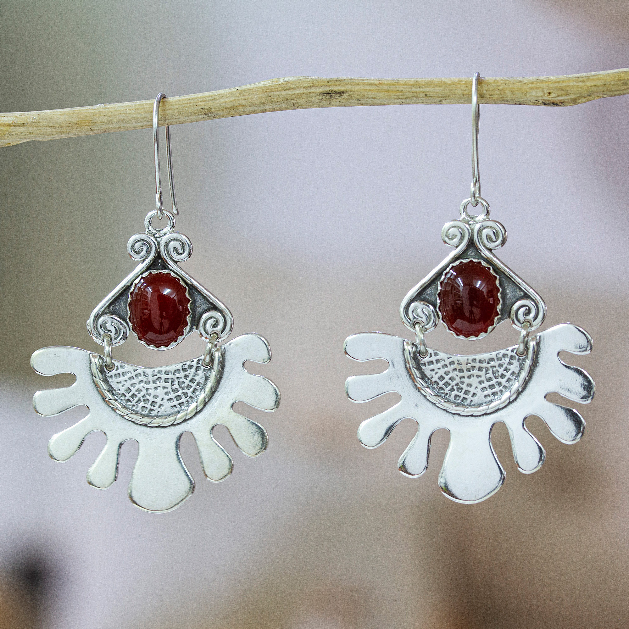 Adapting a motif from pre-Hispanic Mexico, Gianluca Anzani creates an Aztec flower. Crowned by glowing carnelian, the blossoms dance gracefully with every movement. The sterling silver shapes are cut out by hand, thus size could vary slightly.