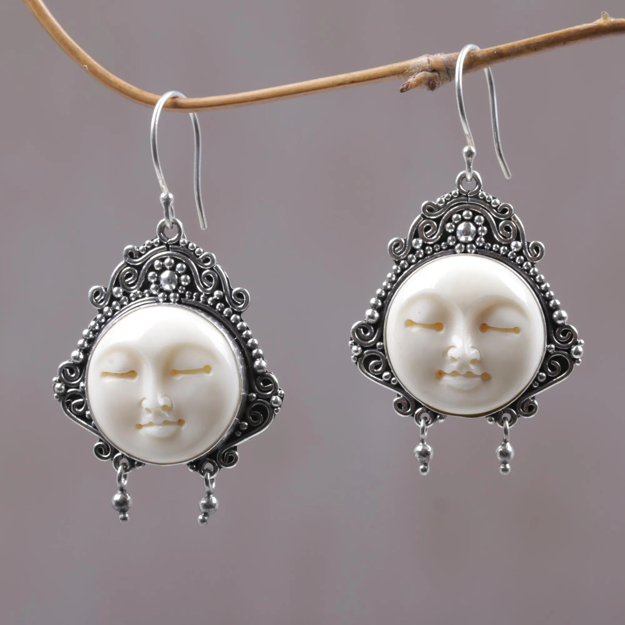 Carved Bone Dangle Earrings, 'Moon Princess'