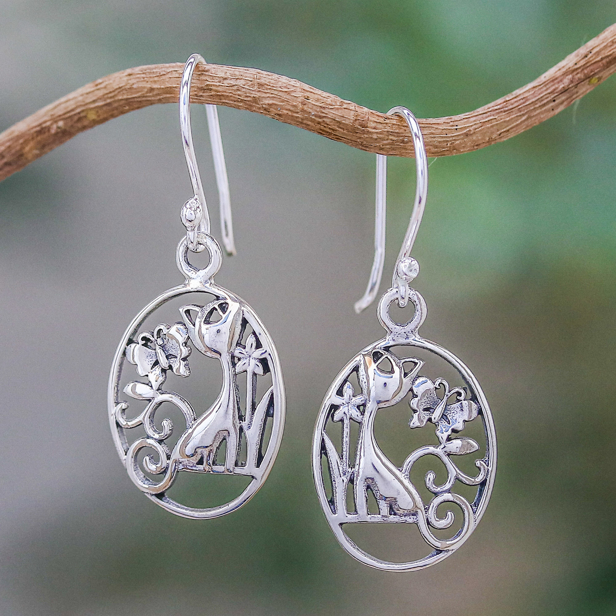 A cat and butterfly make fast friends in the endearing design of these dangle earrings from Thailand. Presented by Pichaya, each earring is crafted of sterling silver in an oval shape, its designs realized in lovely openwork.