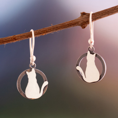 A cat gazes toward an unseen horizon in these round sterling silver dangle earrings, its back turned as if guarding a secret only it can see. The simple yet powerful silhouette radiates calm, independence and an elegance that needs no introduction, while the circular frame transforms into a miniature portal where this stylized figure invites you to imagine untold stories and quiet moments. Created by Zaida Lanning in Peru, these earrings are perfect for anyone drawn to the subtle magic of the feline world.
