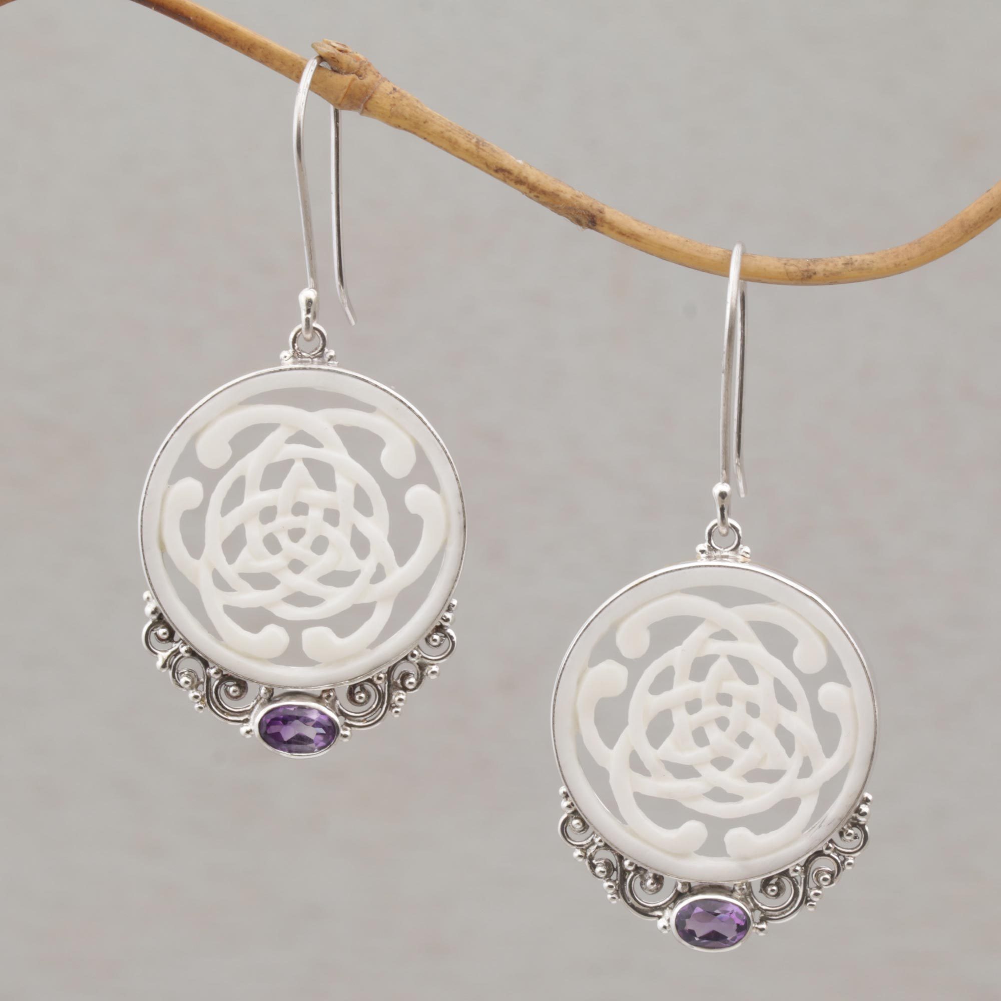 Carefully-carved discs of smooth white cow bone call to mind ancient Celtic knot motifs in these earrings from Made Wardika. Set in sterling silver, the earrings are enhanced by faceted ovals of sparkling lilac amethyst. The earrings swing from sterling silver hooks.