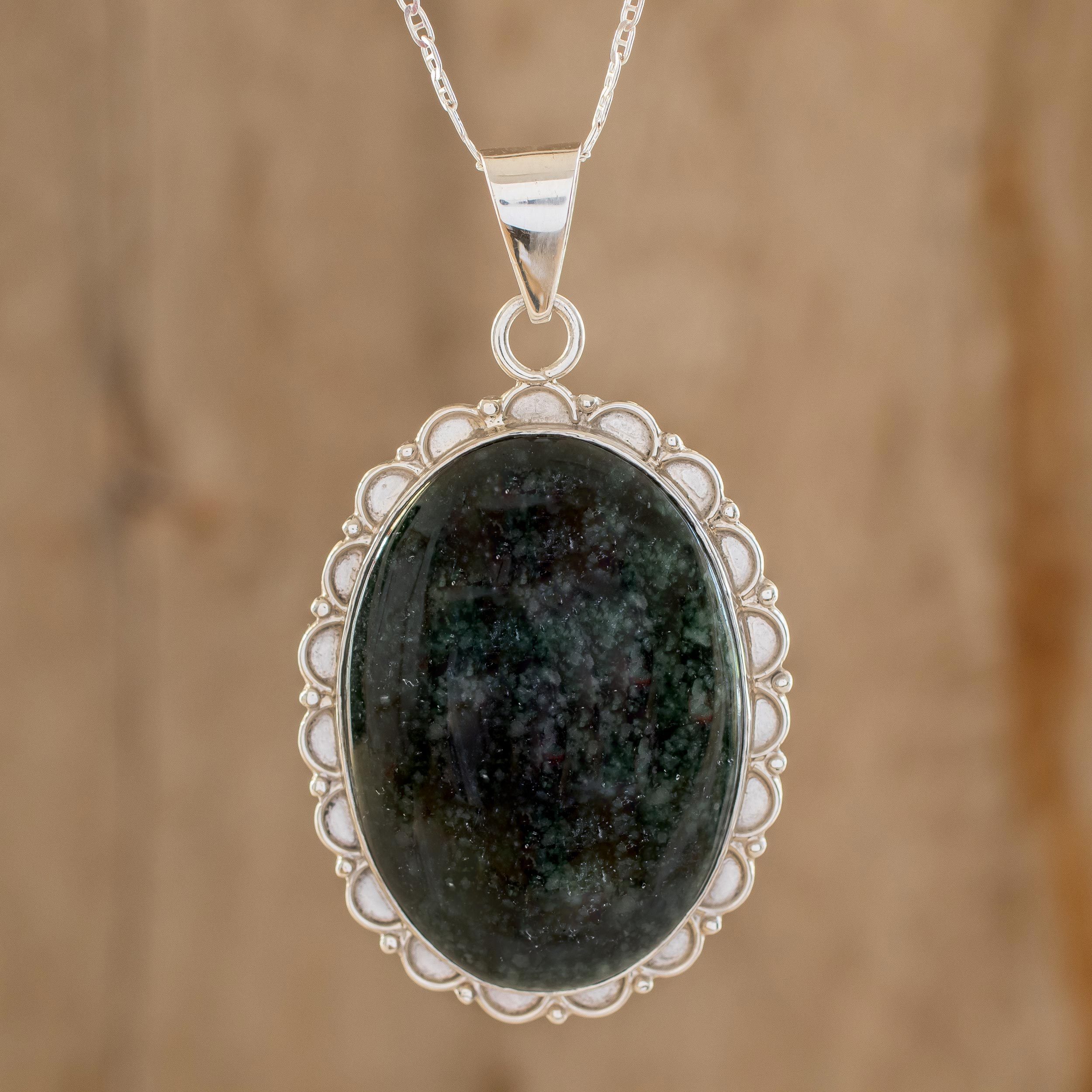 Known as Ya'ax Chich, natural jade was regarded as a sacred stone by the Maya people. They believed three jade stones separate the sea from the sky. Guatemala's Zandra Lorena Sajbin preserves Maya traditions with this beautiful necklace. Set in sterling silver, the gemstone evokes a verdant forest.