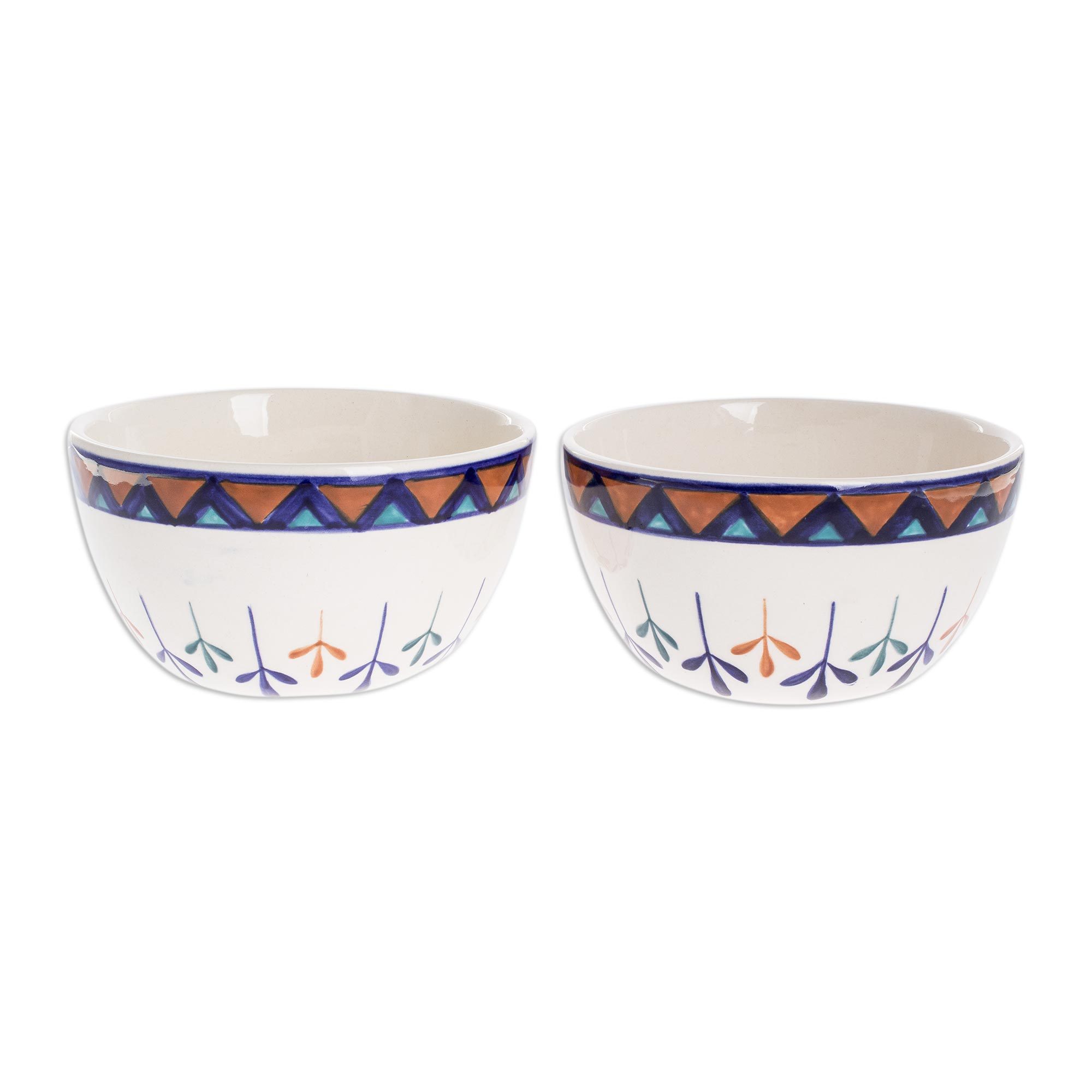 This pair of deep bowls is perfect for serving pasta or noodles, soups, stews and saucy dishes. Crafted by ceramicist Lilyan Benecke of Guatemala, they feature a geometric and floral-inspired design in blue and orange on an off-white background.