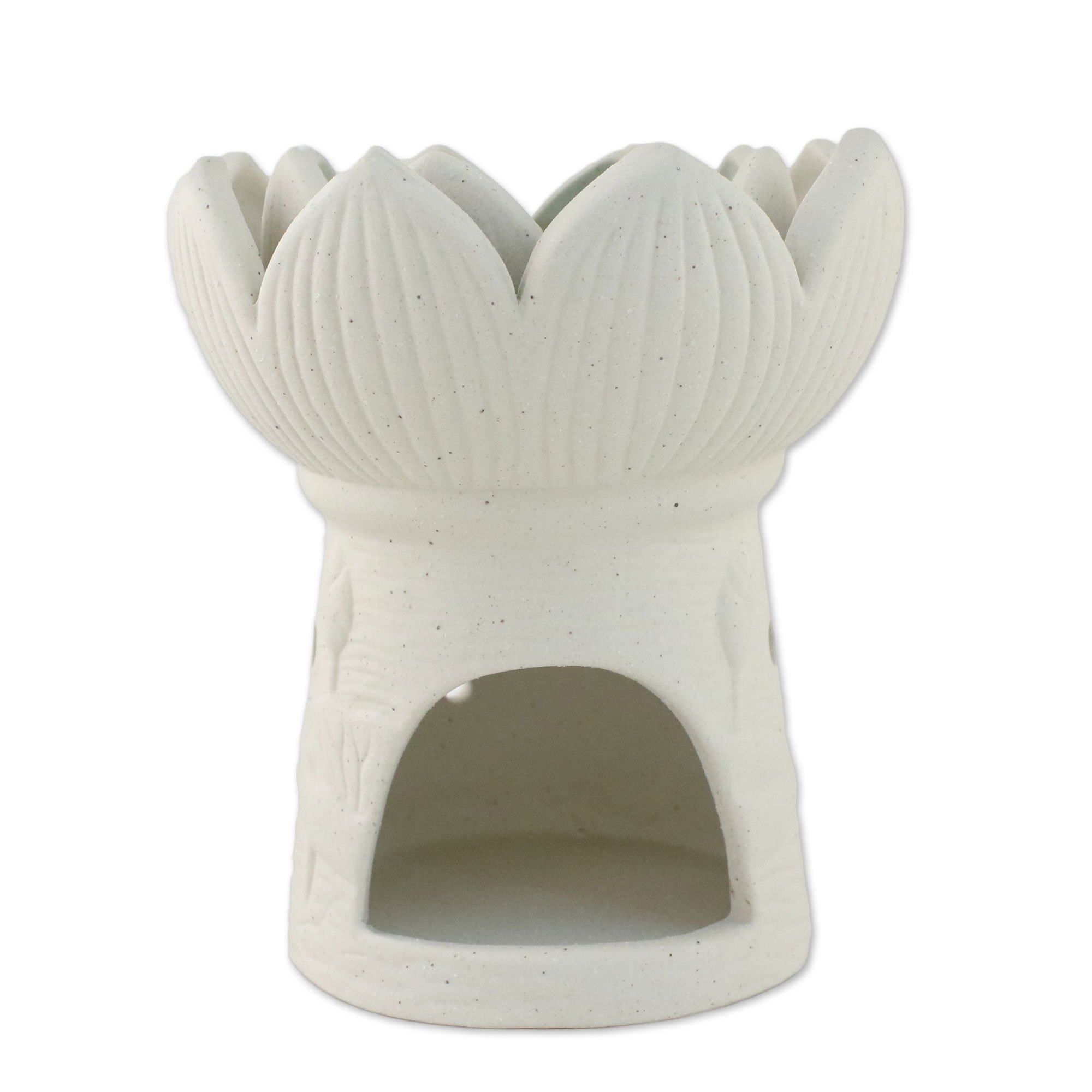 Ceramic Natural White Lotus Flower Oil Warmer, 'Fragrant Lotus in White'