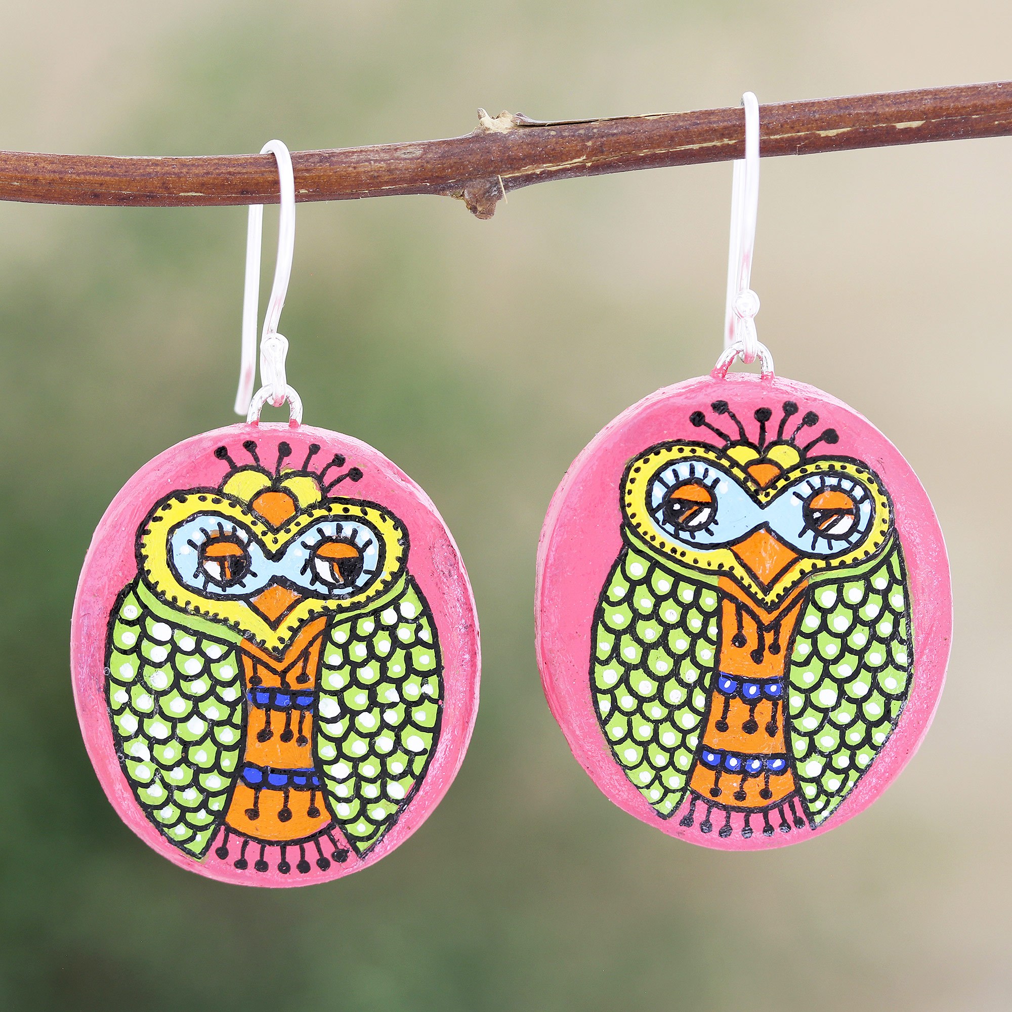 Designed and crafted from oven-fired terracotta Ritu Thapar's dangle earrings feature a carefully painted peacock who peeks out from a lovely pink backdrop. Indian artisans craft the earrings from double fired clay before hand painting the surface with glossy lacquer. Polished sterling silver hooks finish the earrings with a touch of luxurious shine.
