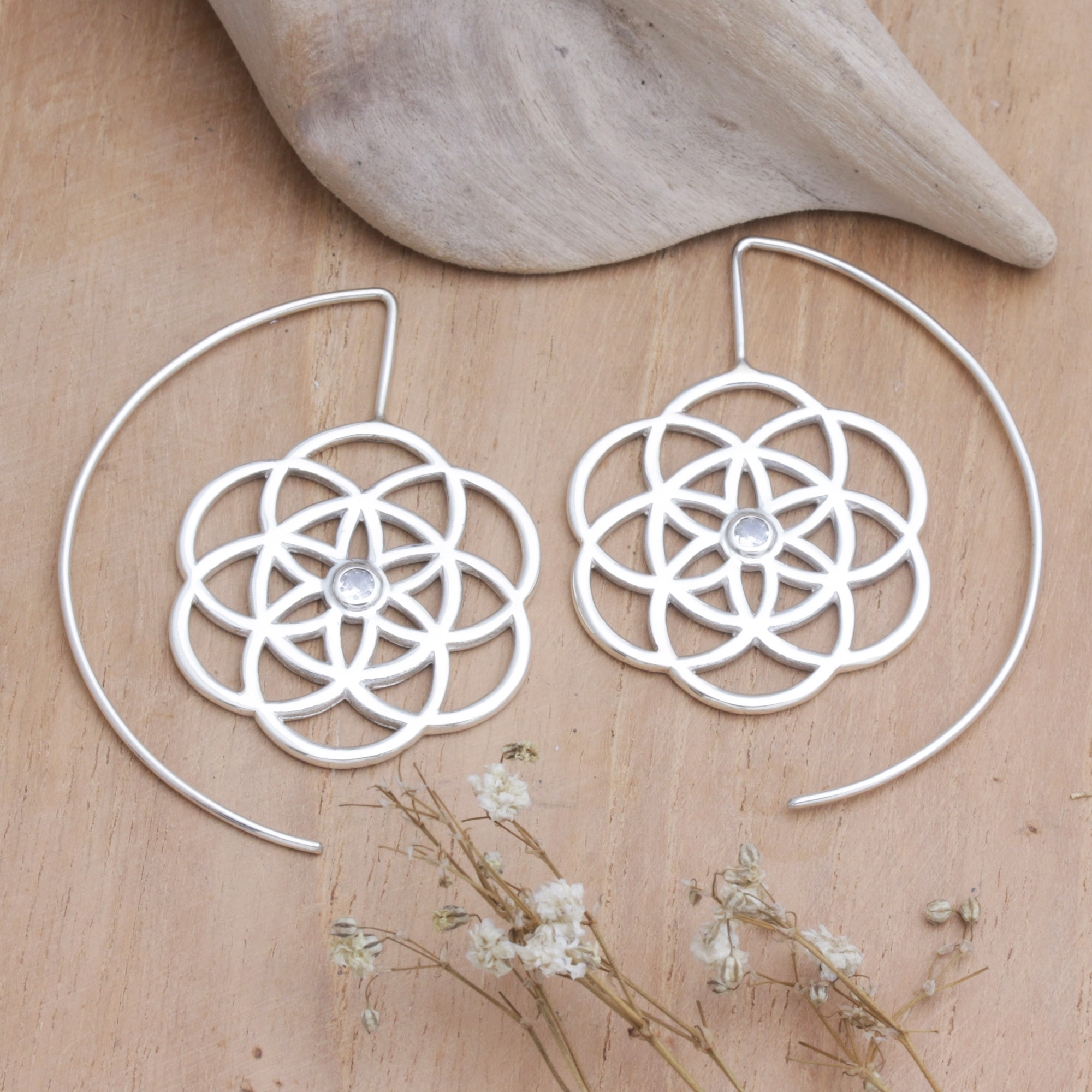 An ancient doctrine stated that the human body was regulated by multiple energy centers, creating the now-famous concept of chakra. As the main element in many wellness courses, this belief inspires Bali's Kadek Aridyah to craft these sterling silver drop earrings featuring blossom pendants reminiscent of chakra symbols, both enhanced with faceted cubic zirconia stones.