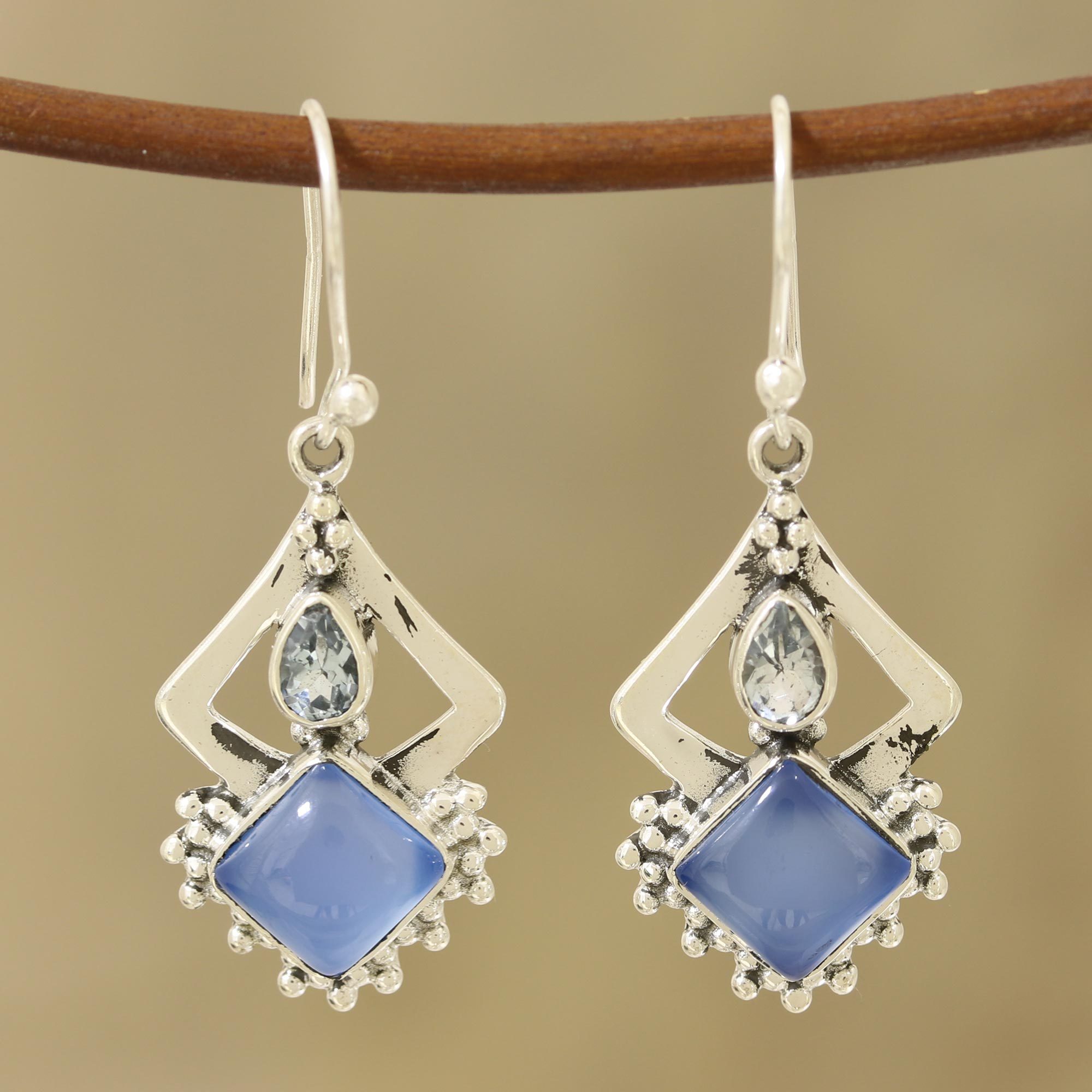 Combining the sparkle of blue topaz with the soft gleam of blue chaldedony, these earrings from India are presented by Neeru Goel. The gemstones are framed by designs in sterling silver; a diamond shape frames the blue topaz while beaded details accent the chalcedony.