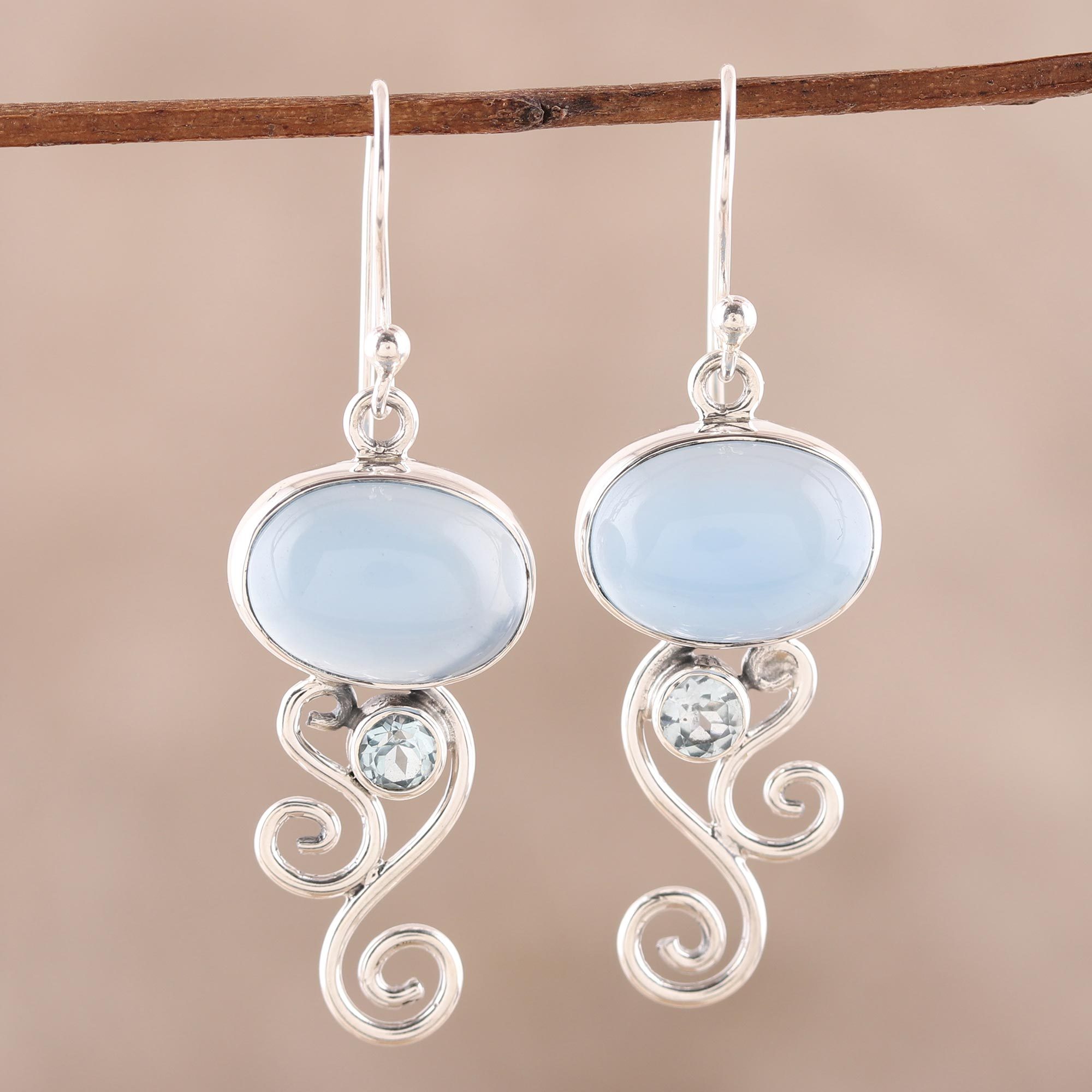 Chalcedony and Blue Topaz Dangle Earrings from India, 'Oval Tendrils'