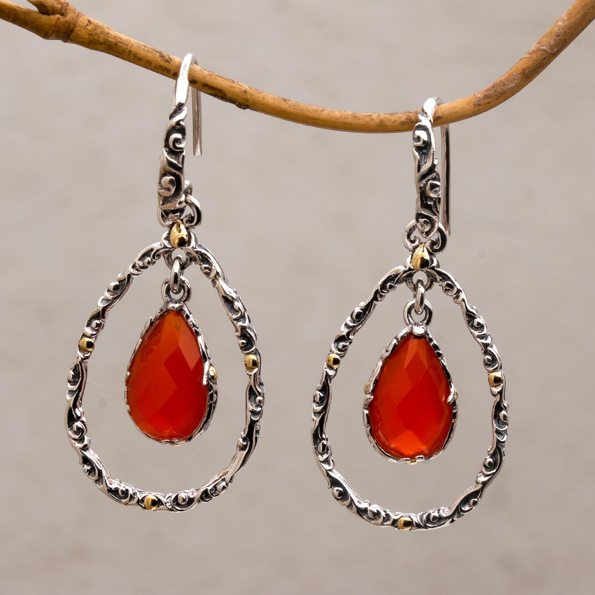 Over eight carats of faceted briolette orange chalcedony shimmer brilliantly in this pair of dangle earrings from Bali. With a passion for creating jewelry for almost two decades, artisan Lenny uses sterling silver to create the floral pattern of vines that surround the stunning gemstones. Each earring is adorned with seven petite accents of 18k gold, which accentuate the luxurious allure.