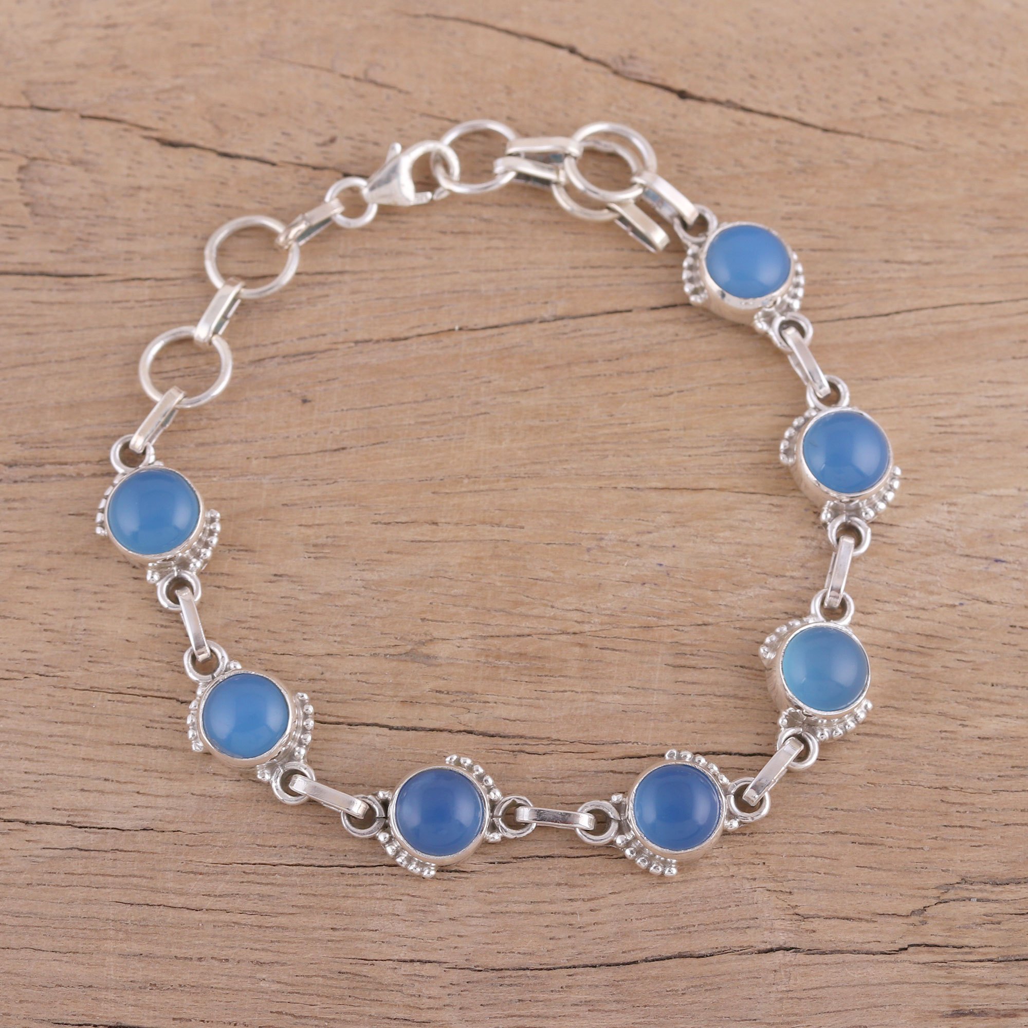 Charming orbs of blue chalcecony circle the wrist, featured in this amazing bracelet presented by Alok Jain. He works with local artisans, who craft the bracelet with sterling silver links that connect the stones. An adjustable length lets this accessory fit the wrist comfortably.