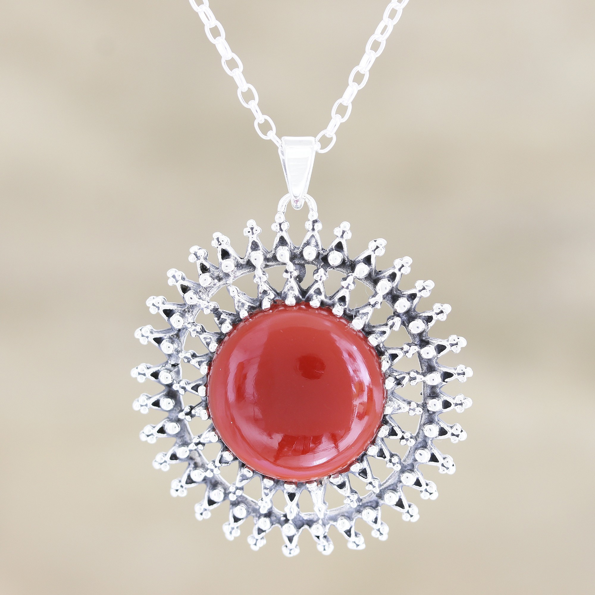 A smooth, red chalcedony gemstone glows at the center of this mesmerizing pendant necklace designed by India's Shivani Choudhary. An openwork sterling silver design frames the stone, radiating outward like rays from the sun.