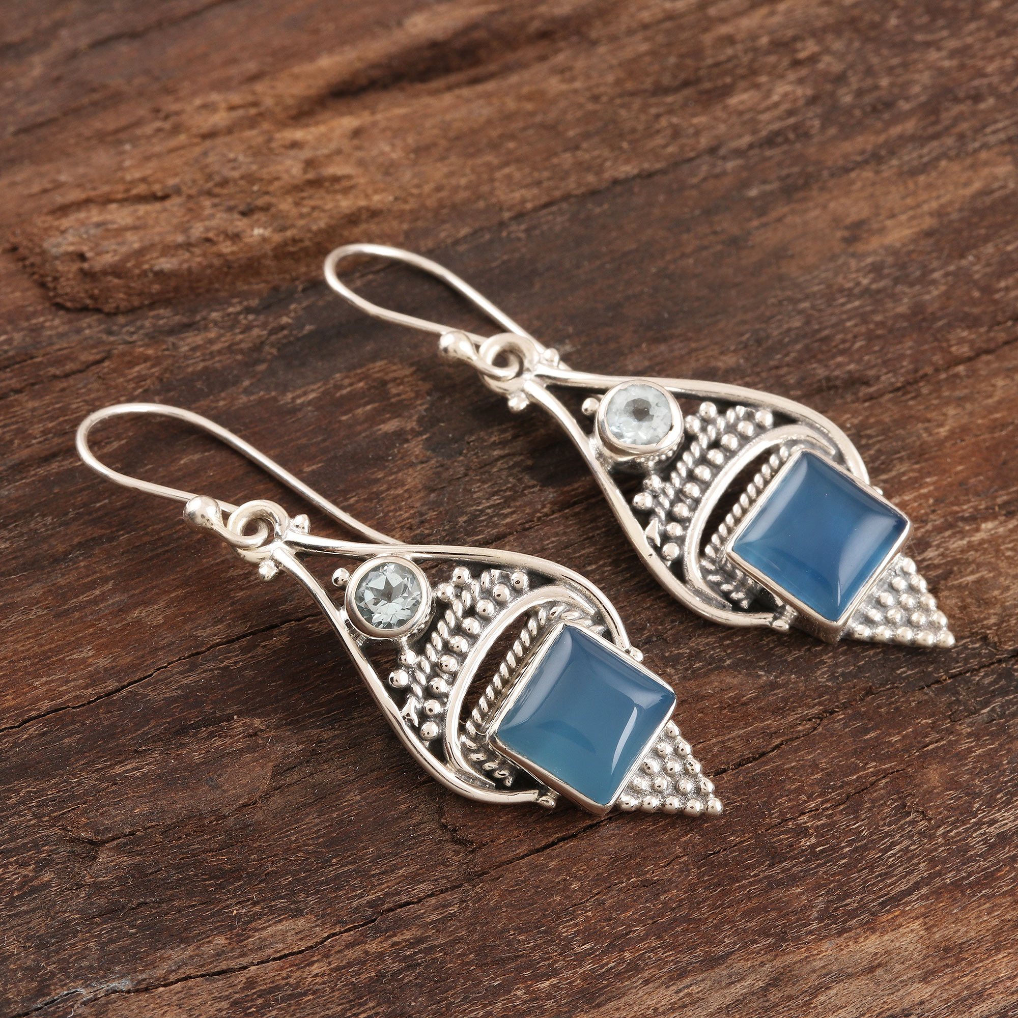 Believed to absorb negative energy, chalcedony brings the mind, body, emotions, and spirit into harmony. These intricate dangle earrings from Neeru Goel of India start with tiny droplets of sterling silver above small, round faceted blue topaz. The design gives way to an intricate pattern of silver roping and balls before culminating in square, bezel-set chalcedony cabochons.