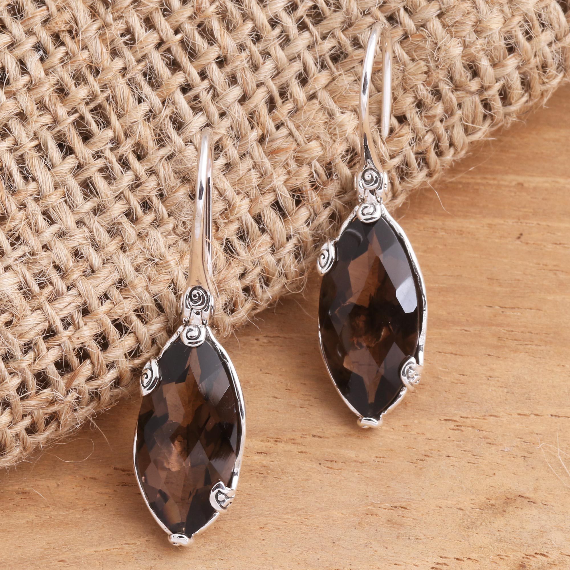 Marquise-shaped smoky quartz gems totaling eight carats hang from sterling silver ear wires in these earrings presented by Bali's Zayd Makarim. Skillful hands craft the bezels with delicate swirls that hug the edge of the gemstones.