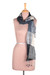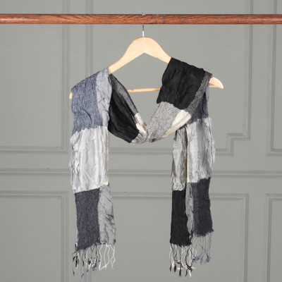 Checkerboard-Themed Ruffled Patchwork Fringed Silk Scarf, 'Mystique Grey'