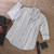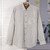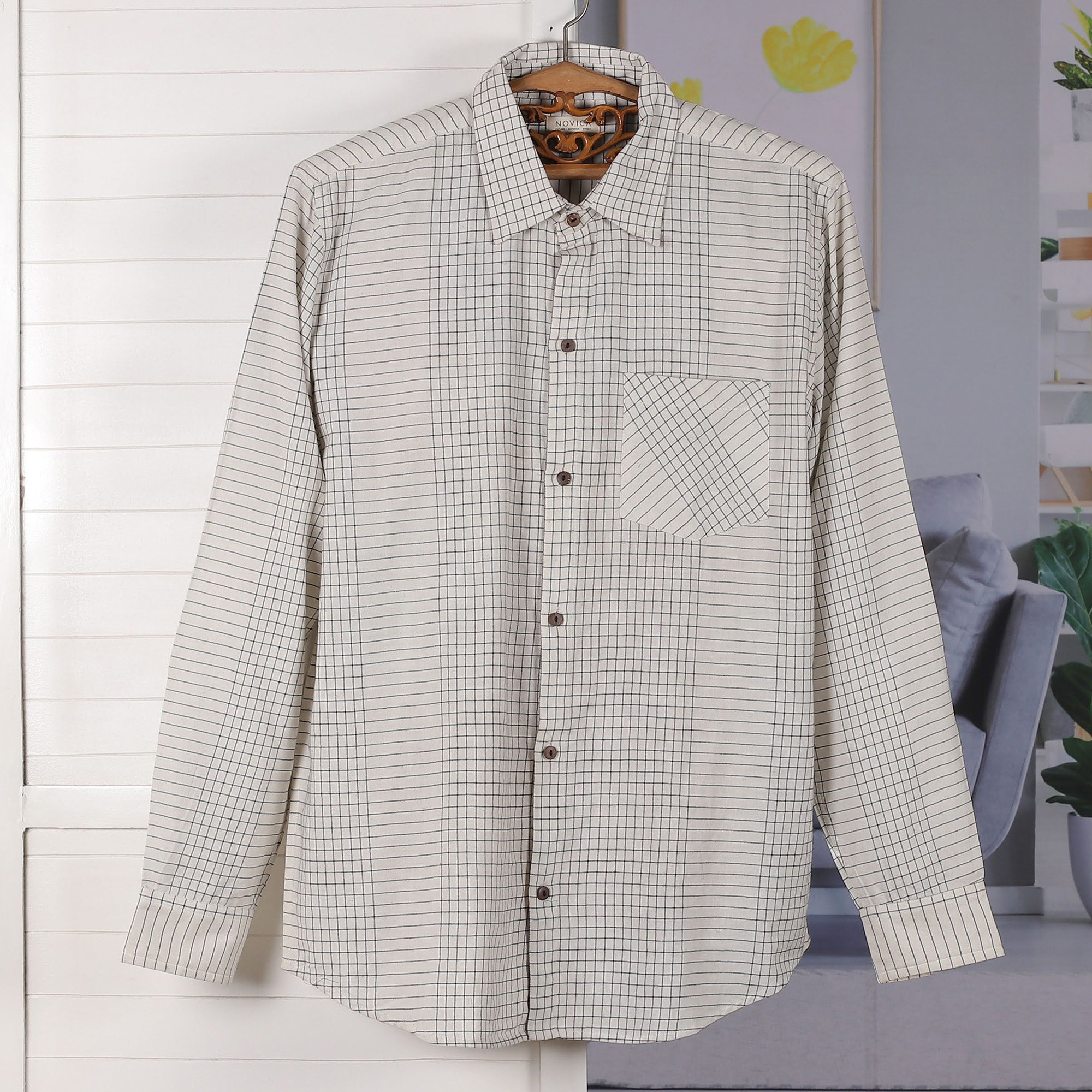 Add a touch of modern elegance to your wardrobe with this mens cotton shirt by Ritu Agnihotri of India. A broken black grid pattern creates subtle striped panels throughout the fabrics weave of this collared shirt. Featuring long sleeves, chest pocket and wooden buttons on the front closure and cuffs.