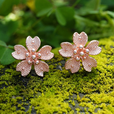 Precious rose gold-plating transforms into delicate botanical sculptures in these stunning button earrings that celebrate the perfect silhouette of cherry blossoms. Balinese artisan Yuniati's chic design pays homage to nature's beauty with each textured petal, becoming as organic and alive as the flowers that inspired them.