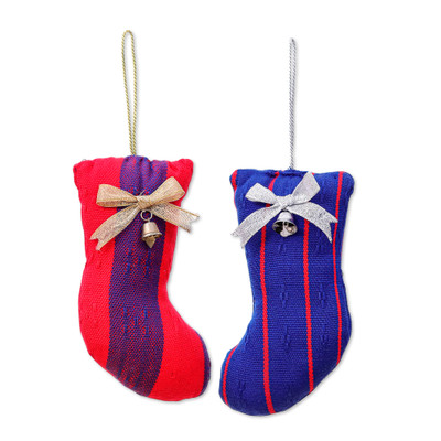 Thailand's Weave Fair Trade artisan group is ready to celebrate the merriest time of the year. Inspired by Christmas traditions, this set of two rayon ornaments assumes the shape of classic stockings in a striped pattern. Purple, blue and red hues unite in each piece, while ribbons and aluminum bells crown the set with a sweet holiday melody.