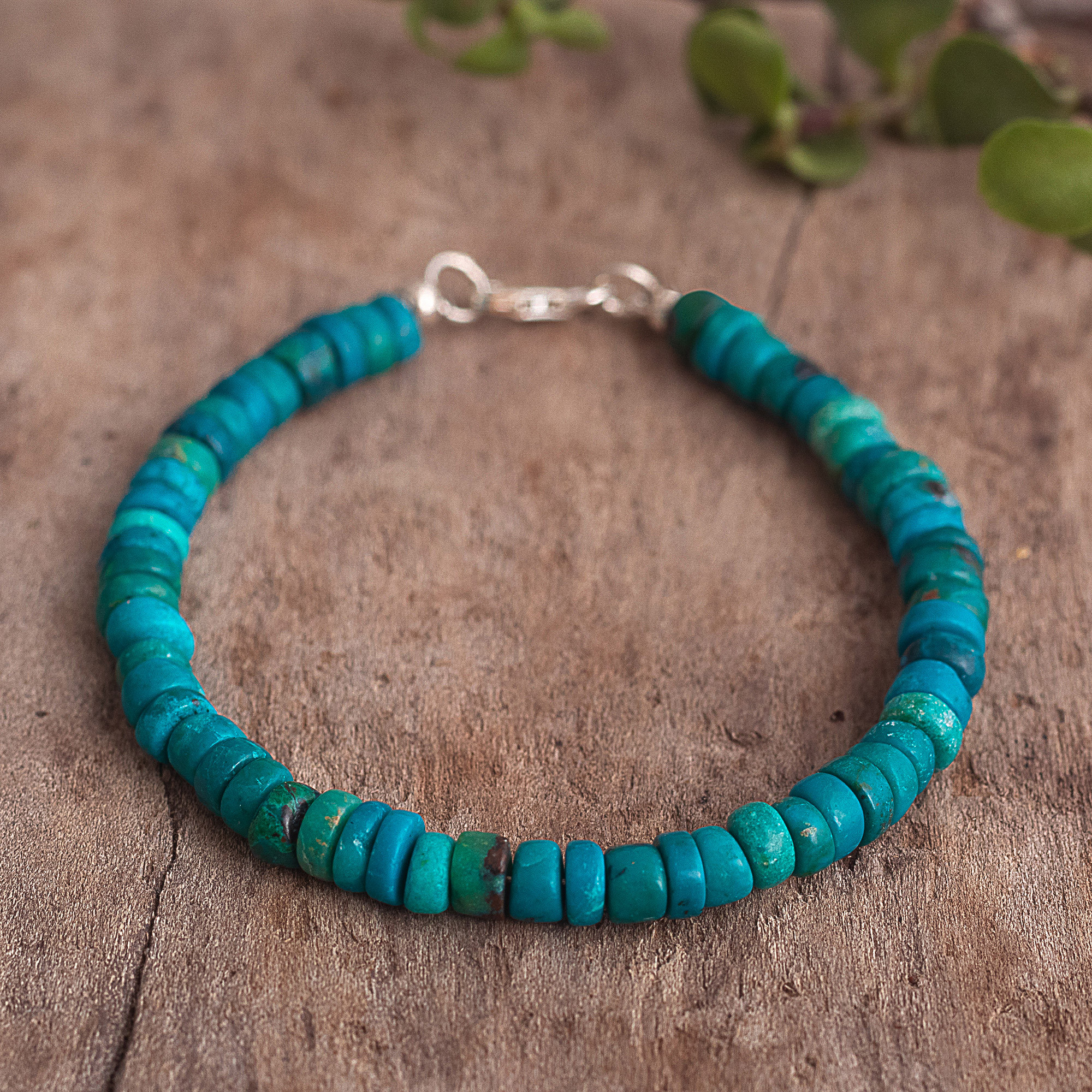 Polished rondelles of natural chrysocolla seem to capture the endless blues and greens of the ocean. Sandra and Lily in Peru craft this pretty beaded bracelet, which features a clasp of polished sterling silver.
