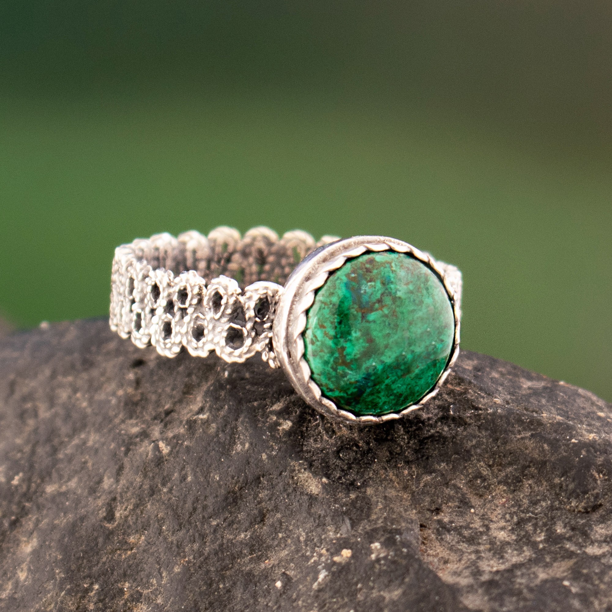 Chrysocolla Cocktail Ring with a Filigree Band from Peru, 'Andean Power'