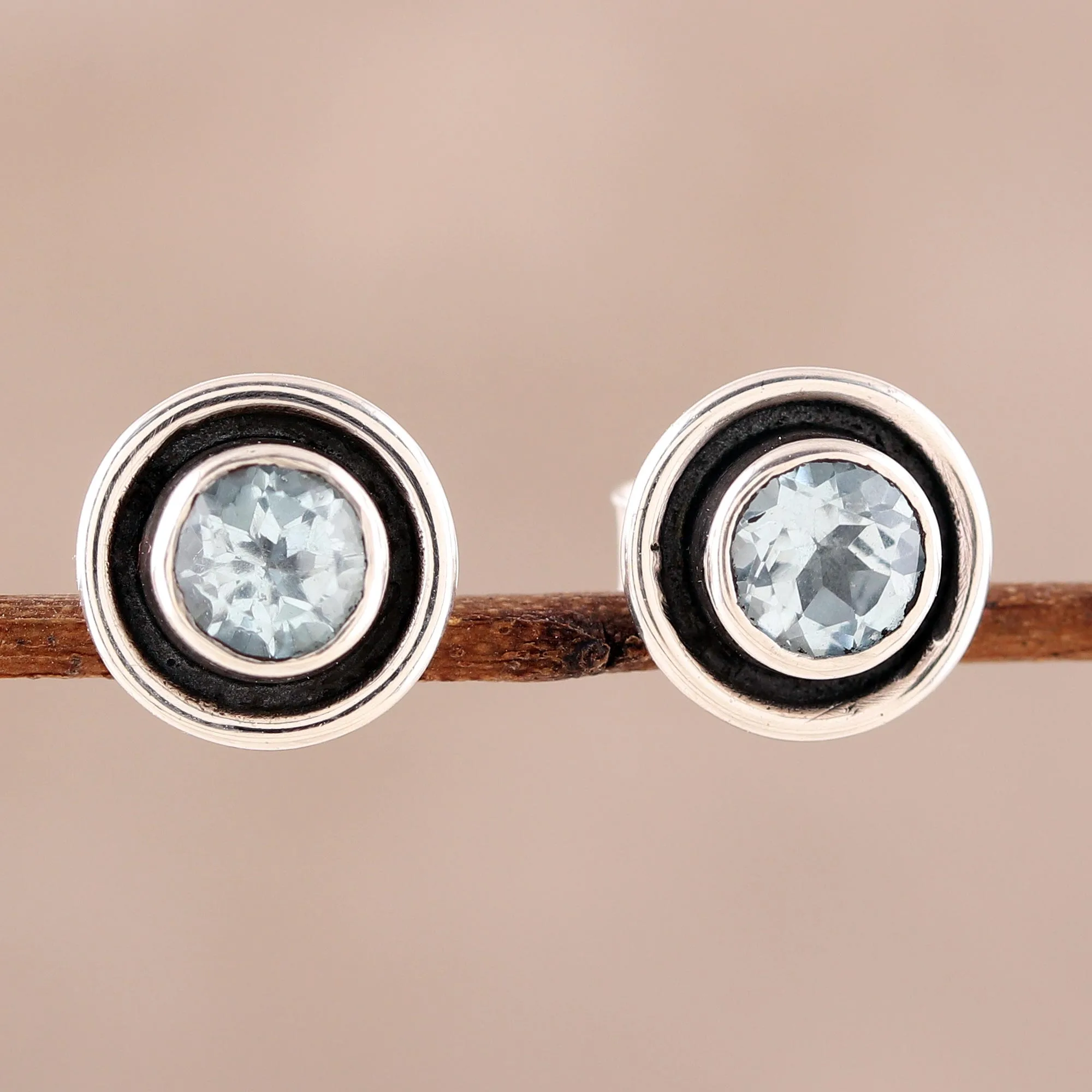 Circular Blue Topaz Stud Earrings from India, 'Graceful Frames'