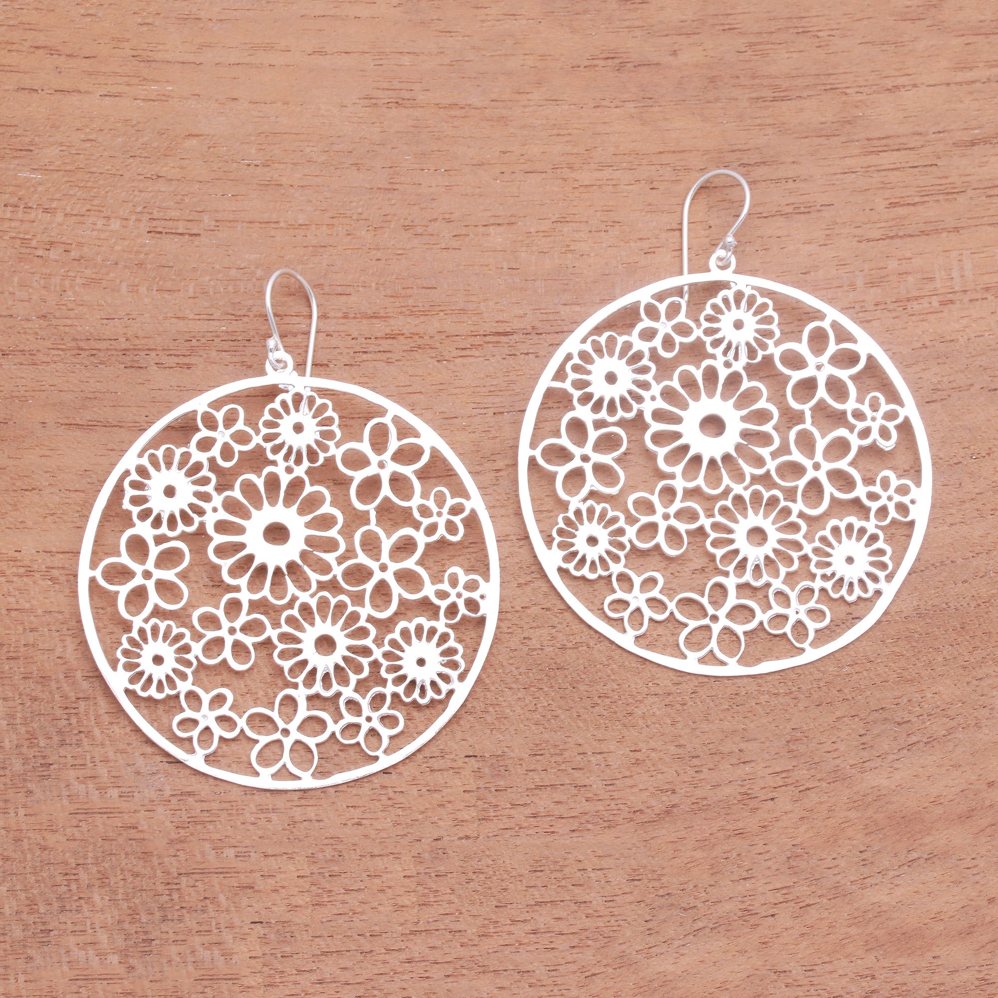 Circular Floral Sterling Silver Dangle Earrings from Bali, 'Circular Bouquets'