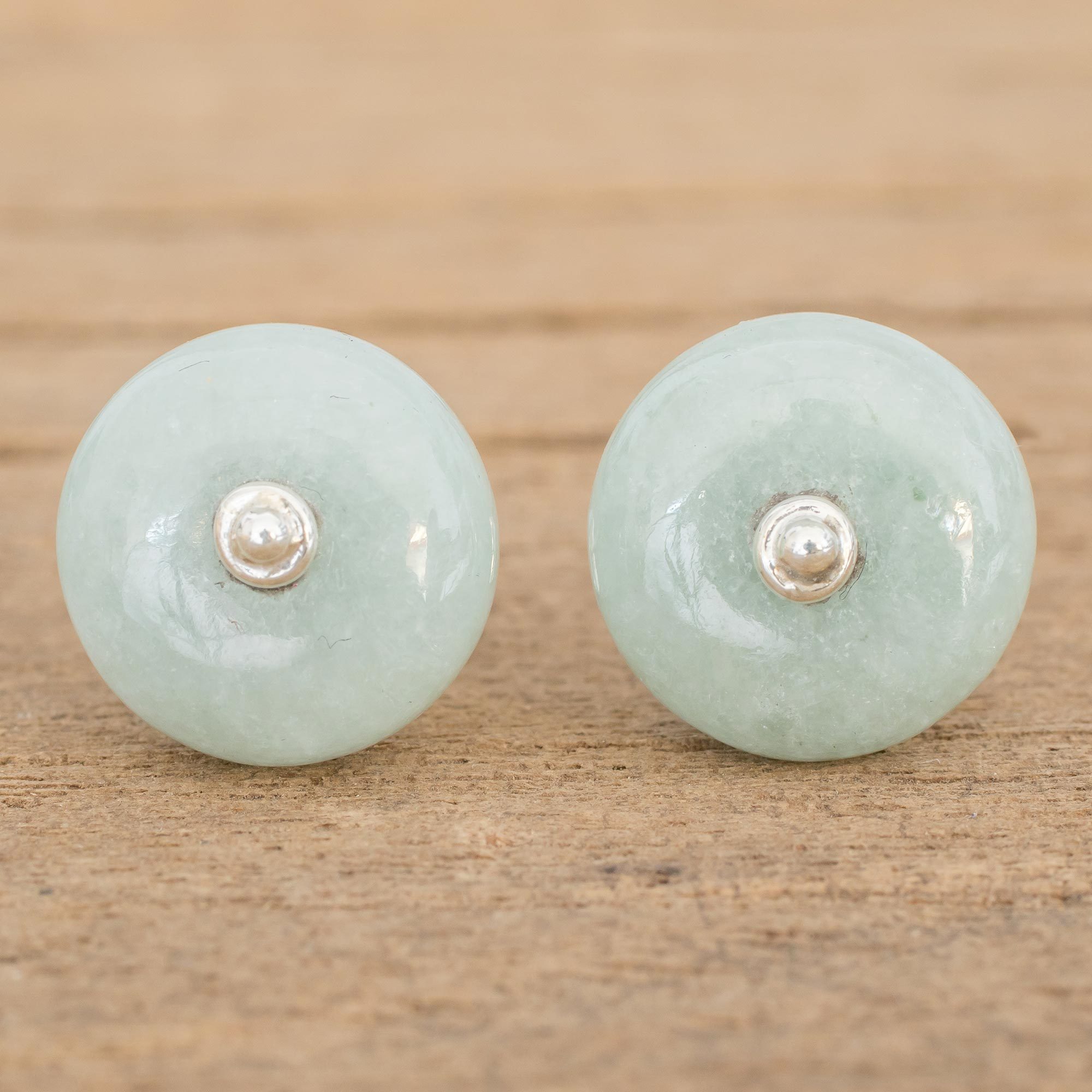 Celebrated by the ancient Maya, two medallions of natural apple green jade are featured in this pair of stud earrings from Guatemala. Zandra Lorena Sajbin creates the earrings, studding the stones with sterling silver.