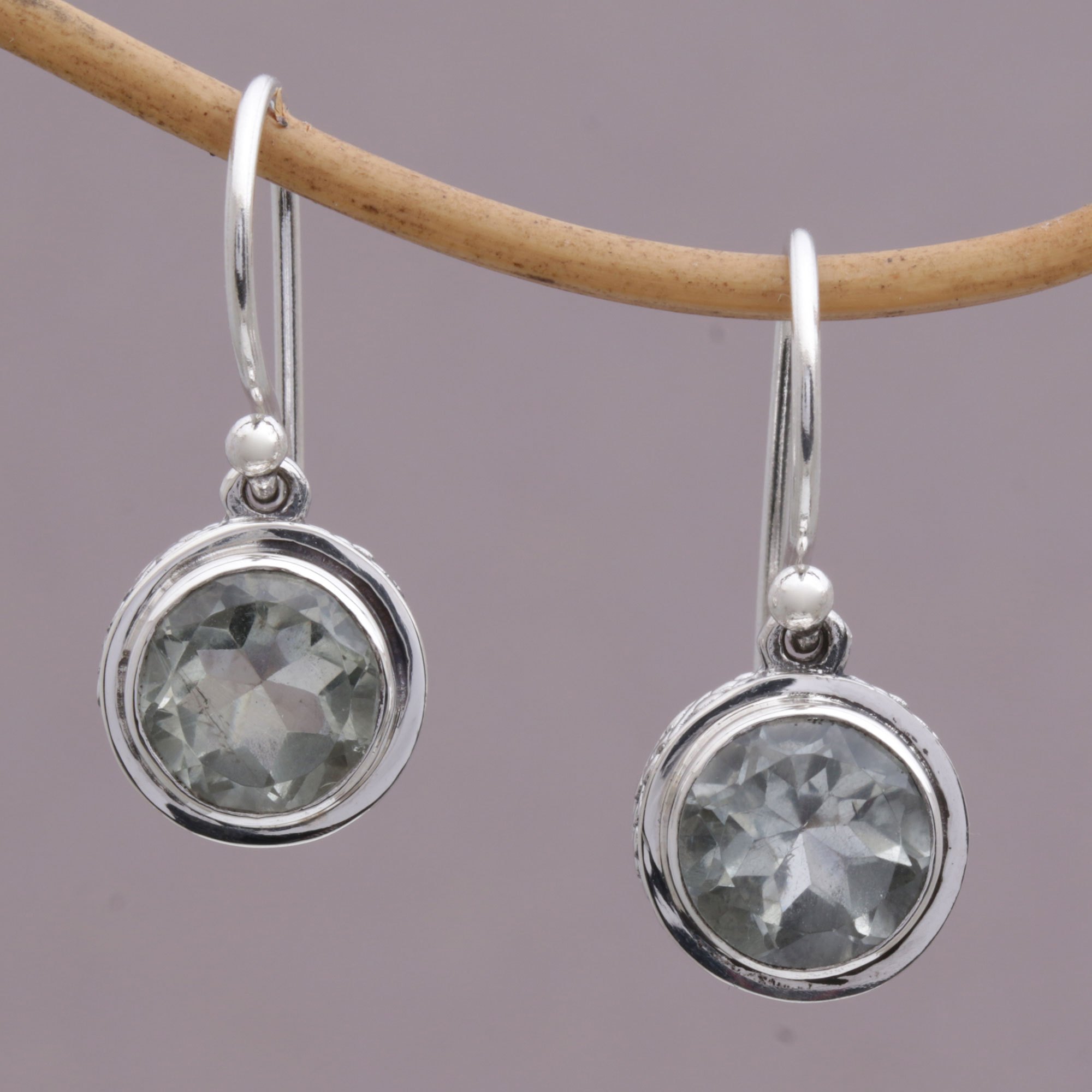 Circular Prasiolite and Sterling Silver Earrings from Bali, 'Glittering Glance'