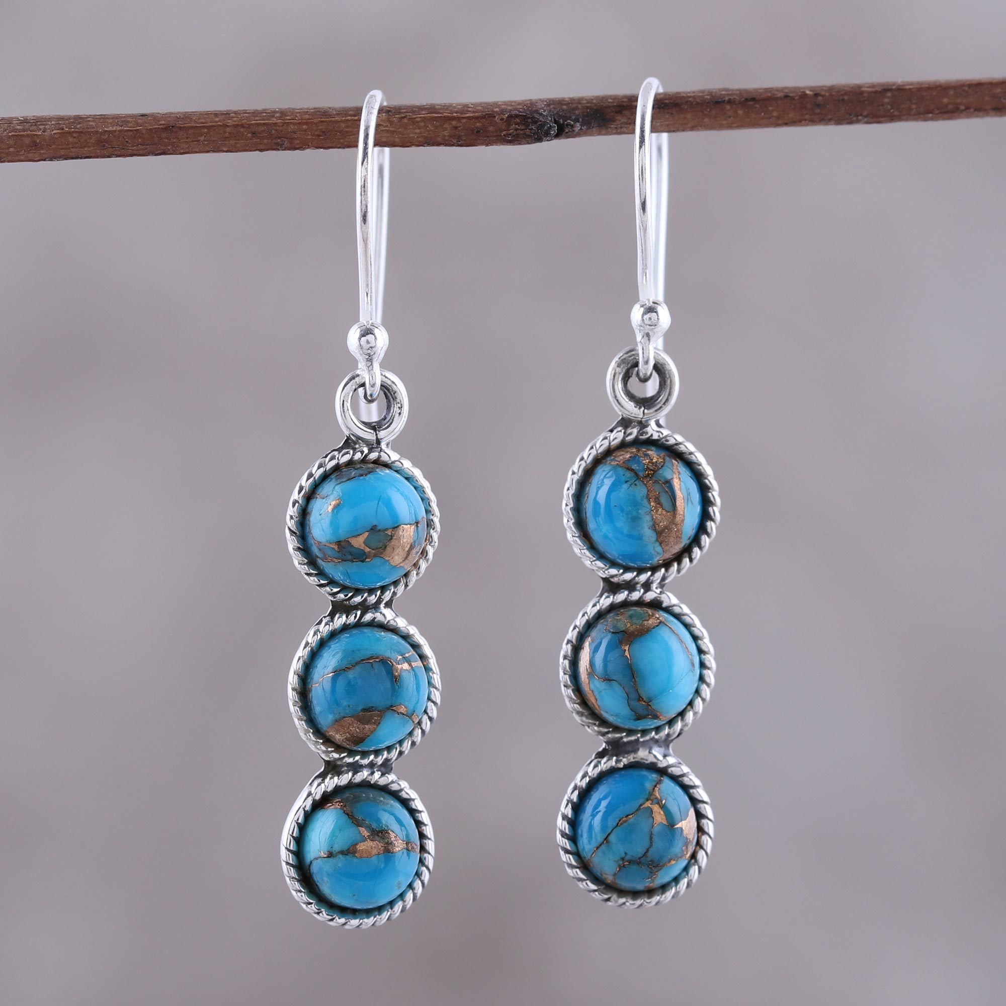 Presented by Alok Jain of India, these dangle earrings dance with circles of sterling silver. Local artisans select pieces of blue composite turquoise that gleam with golden veins.