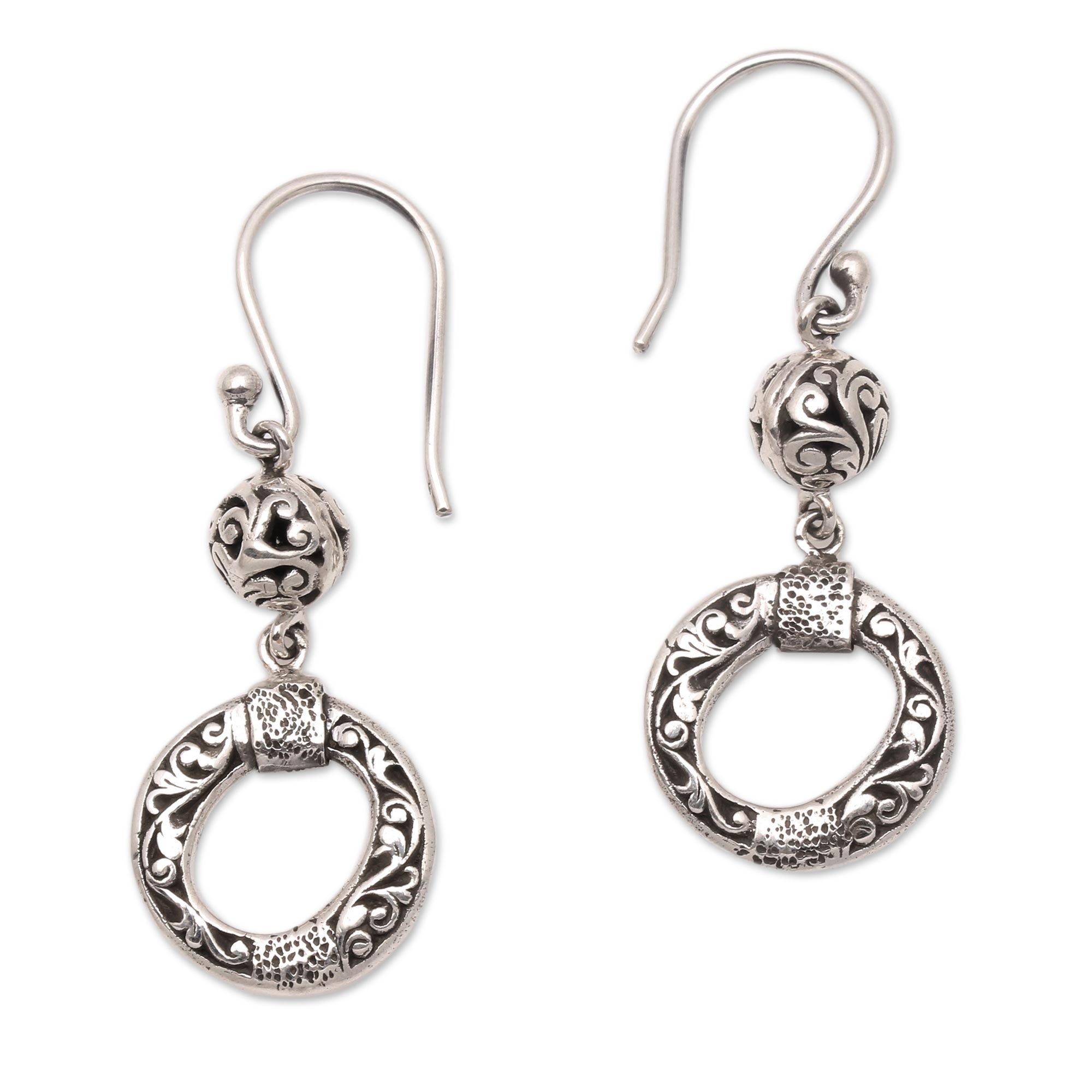 Circular Sterling Silver Dangle Earrings Crafted in Bali, 'Traditional Wreaths'