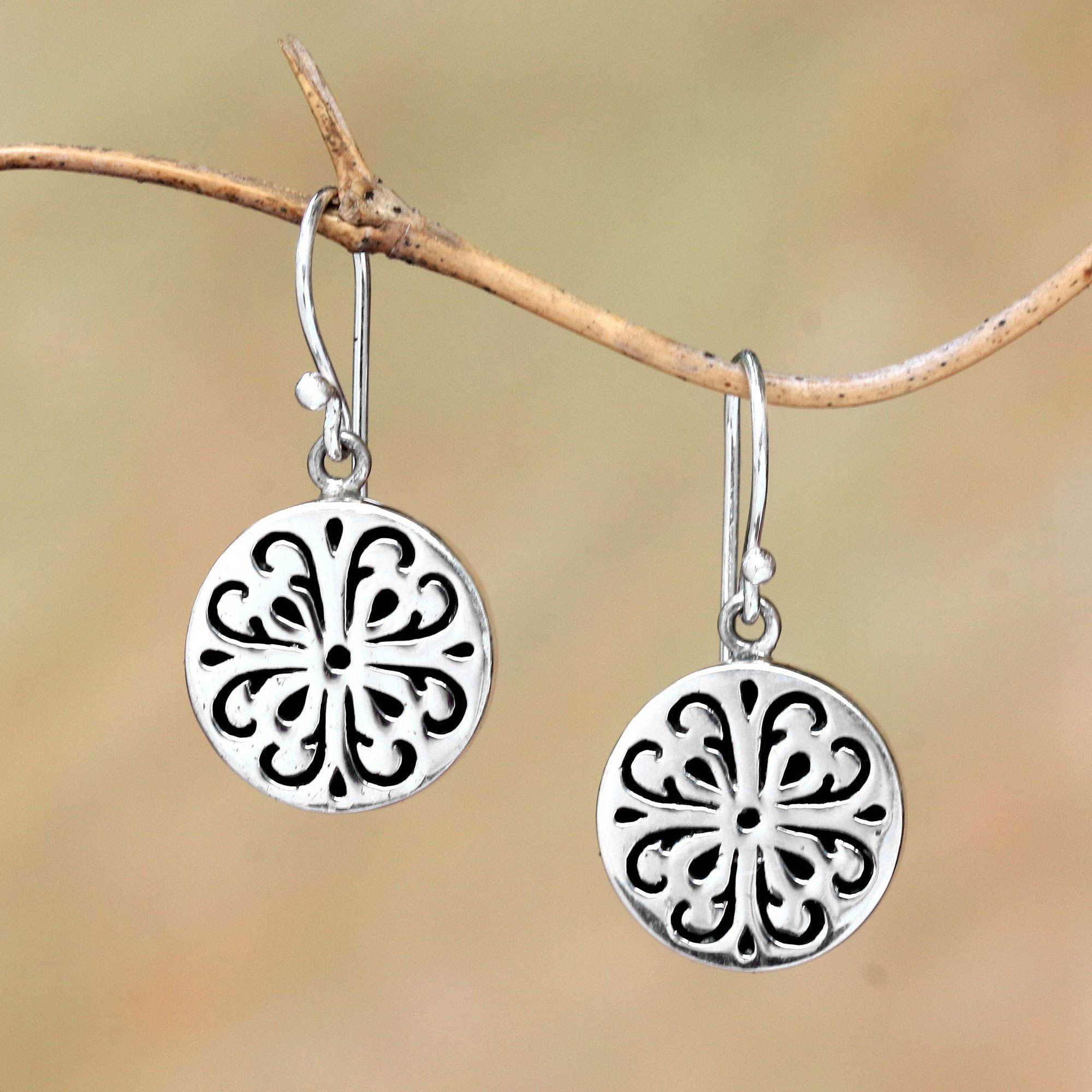 Circular Sterling Silver Dangle Earrings from Bali, 'Lovely Medallions'