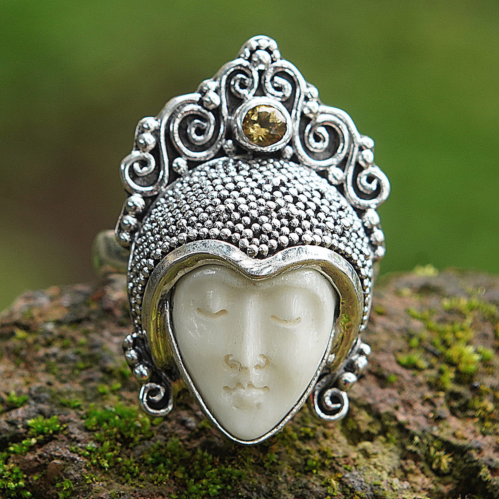A regal prince carved from cow bone sleeps soundly under a gleaming crown. By Buana from Indonesia, this unique cocktail ring also features .925 sterling silver and citrine. The intricate texture of the prince's crown gives this ring an unusual glamour.