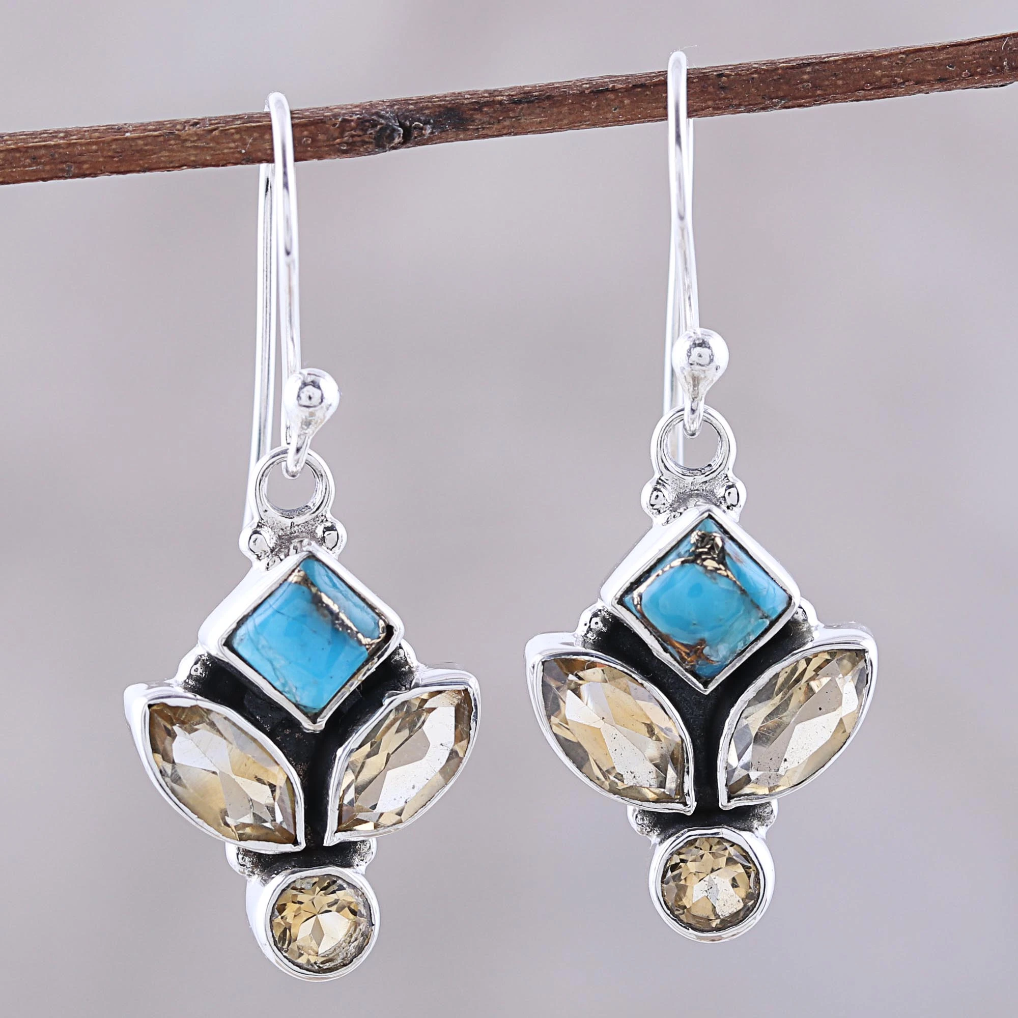 Citrine and Composite Turquoise Dangle Earrings from India, 'Sparkling Unity'