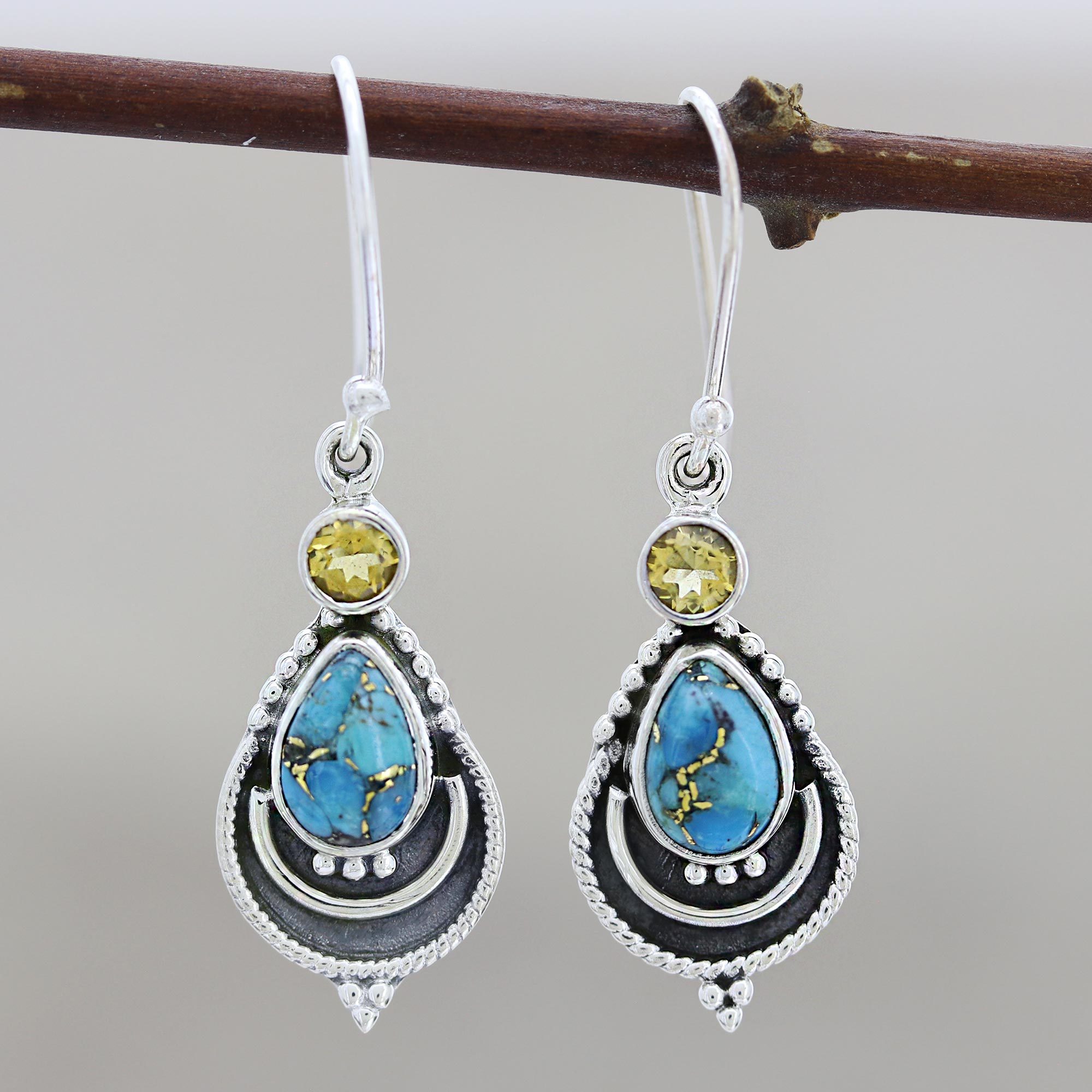 Citrine and Composite Turquoise Earrings from India, 'Aravalli Allure'
