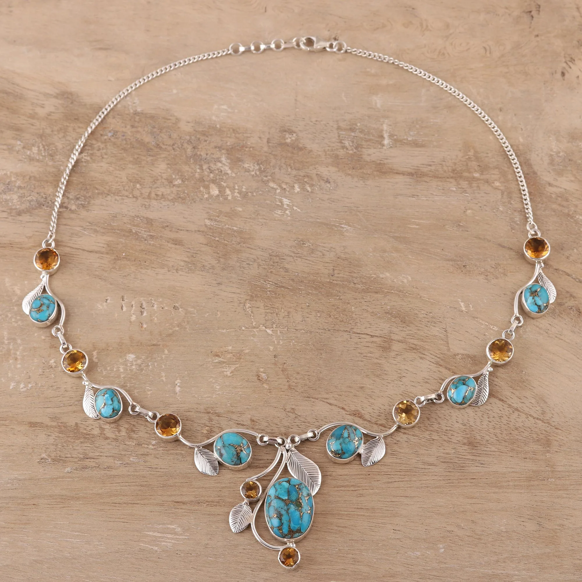 Caressed by sterling leaves, sky blue composite turquoise gems nestle in silver settings. They mingle with faceted citrine totaling 5.6 carats. Crafted by hand, this extraordinary necklace is presented by India's Neeru Goel.