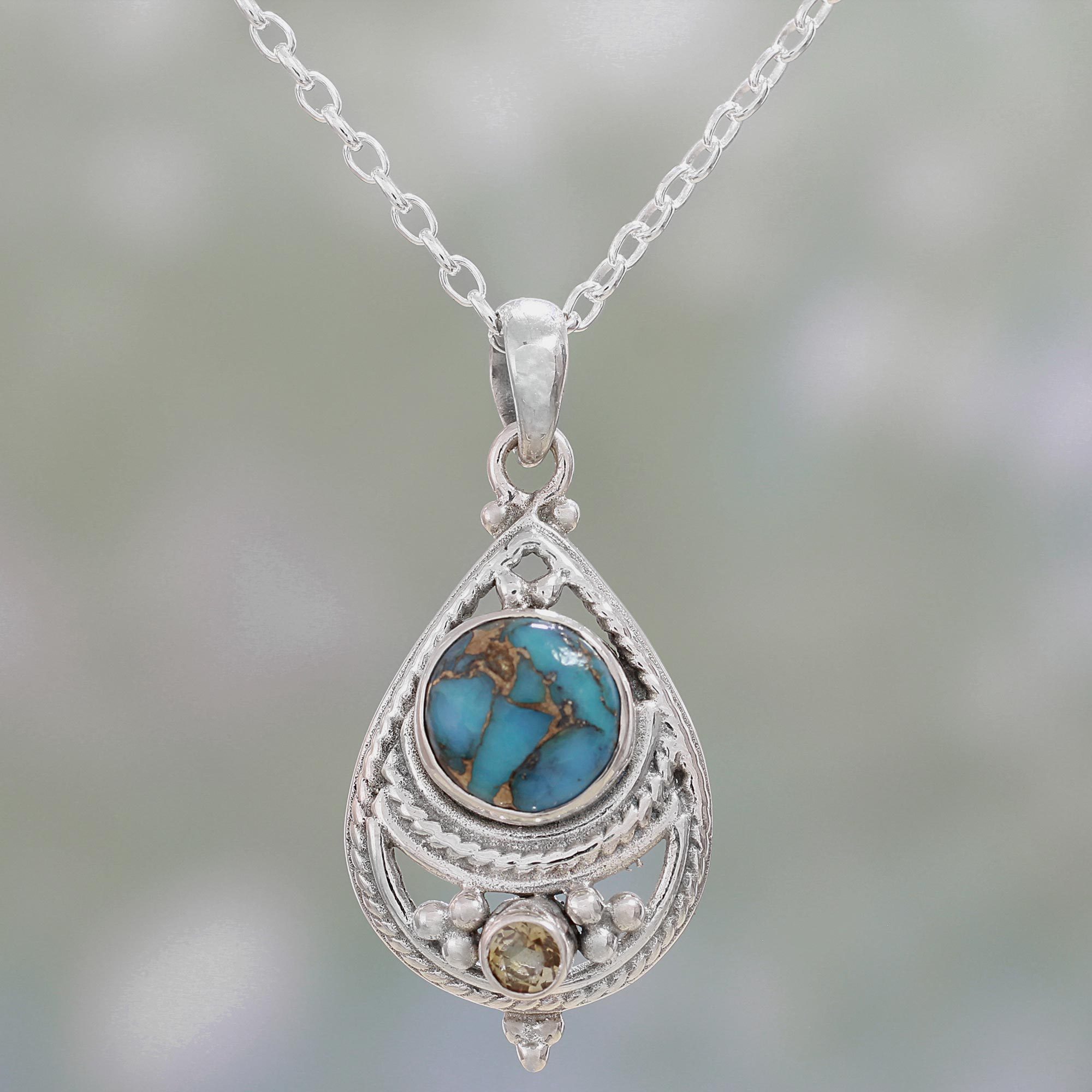 India's Neeru Goel presents a new handcrafted pendant necklace of exquisite beauty. A smooth blue composite turquoise cabochon stone within a sterling silver bezel setting forms the center of the teardrop-shaped pendant, while a smaller round citrine gemstone forms a second point of interest. A sterling silver dot motif embellishes the pendant, which is suspended from a cable chain.